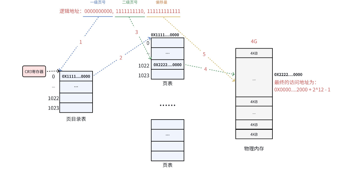 所以我们从内存中查询数据时,需要经过的步骤为:页目录 => 页表 => 内存块 => 数据(页内偏移)。也就完成了虚拟到物理的转化。