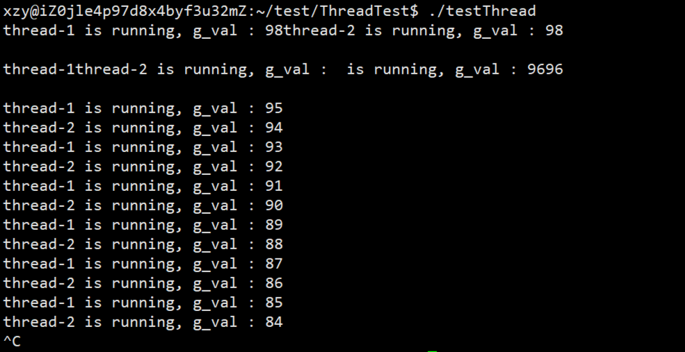 #include <iostream> #include <pthread.h> #include <string> #include <unistd.h>int g_val = 100;void* threadrun1(void* args) {std::string res = static_cast<char*>(args);while(1){g_val -= 1;std::cout << res << " is running, " << "g_val : " << g_val << std::endl;sleep(1);}return nullptr; }void* threadrun2(void* args) {std::string res = static_cast<char*>(args);while(1){g_val -= 1;std::cout << res << " is running, " << "g_val : " << g_val << std::endl;sleep(1);}return nullptr; }int main() {pthread_t tid1, tid2;pthread_create(&tid1, nullptr, threadrun1, (void*)"thread-1");pthread_create(&tid2, nullptr, threadrun2, (void*)"thread-2");pthread_join(tid1, nullptr);pthread_join(tid2, nullptr);return 0; }