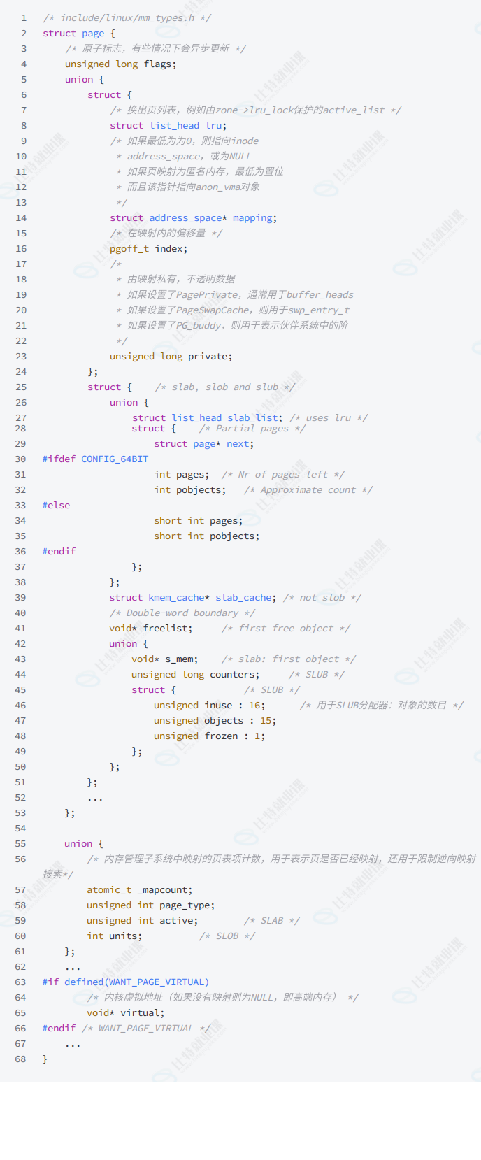 假设⼀个可⽤的物理内存有 4GB 的空间。按照⼀个⻚框的⼤⼩ 4KB 进⾏划分, 4GB 的空间就是 4GB/4KB = 1048576 个⻚框。有这么多的物理⻚,操作系统肯定是要将其管理起来的,操作系统 需要知道哪些⻚正在被使⽤,哪些⻚空闲等等。内核⽤ struct page 结构 表⽰系统中的每个物理⻚,出于节省内存的考虑, struct page 中使⽤了⼤量的 联合体union。