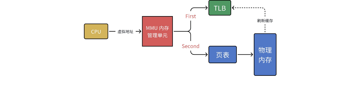 5.注:⼀个物理⻚的地址⼀定是 4KB 对⻬的(最后的 12 位全部为 0 ),所以其实只需要记录物理 ⻚地址的⾼ 20 位即可。6. 以上其实就是 MMU 的⼯作流程。MMU(Memory Manage Unit)是⼀种硬件电路,其速度很快, 主要⼯作是进⾏内存管理,地址转换只是它承接的业务之⼀ 。到这⾥其实还有个问题,MMU要先进⾏两次⻚表查询确定物理地址,在确认了权限等问题后,MMU再 将这个物理地址发送到总线,内存收到之后开始读取对应地址的数据并返回。那么当⻚表变为N级时, 就变成了N次检索+1次读写。可⻅,⻚表级数越多查询的步骤越多,对于CPU来说等待时间越⻓,效率 越低。让我们现在总结⼀下:单级⻚表对连续内存要求⾼,于是引⼊了多级⻚表,但是多级⻚表也是⼀把双 刃剑,在减少连续存储要求且减少存储空间的同时降低了查询效率。有没有提升效率的办法呢?计算机科学中的所有问题,都可以通过添加⼀个中间层来解决。 MMU 引⼊ 了新武器,江湖⼈称快表的 TLB (其实,就是缓存,Translation Lookaside Buffer,学名转译后备 缓冲器)当 CPU 给 MMU 传新虚拟地址之后, MMU 先去问 TLB 那边有没有,如果有就直接拿到物理地址发到总线给内存,⻬活。但 TLB 容量⽐较⼩,难免发⽣ Cache Miss ,这时候 MMU 还有保底的⽼武器 ⻚表,在⻚表中找到之后 MMU 除了把地址发到总线传给内存,还把这条映射关系给到TLB,让它记录 ⼀下刷新缓存。
