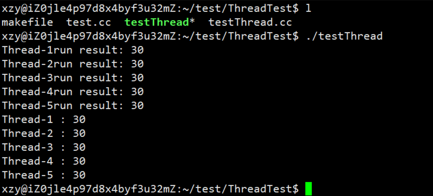 #include <iostream> #include <pthread.h> #include <cstdlib> #include <unistd.h> #include <string> #include <vector> #include <cstdio>const int threadrun = 5; // create five number threadsclass Task { public:Task(){}void SetData(int x, int y){_datax = x;_datay = y;}int Excute(){return _datax + _datay;}~Task(){}private:int _datax;int _datay; };class ThreadData : public Task { public:ThreadData(int x, int y, const std::string &threadname):_threadname(threadname){_t.SetData(x, y); }std::string threadname(){return _threadname;}int run(){return _t.Excute();}private:std::string _threadname;Task _t; };class Result { public:Result(){}~Result(){}void SetResult(int result, const std::string &threadname){_result = result;_threadname = threadname;}void Print(){std::cout << _threadname << " : " << _result << std::endl;}private:int _result;std::string _threadname; };void* handlerTask(void* args) {ThreadData *td = static_cast<ThreadData*>(args);std::string name = td->threadname();Result* res = new Result();int result = td->run();res->SetResult(result, name);std::cout << name << "run result: " << result << std::endl;delete td;sleep(2);return (Result*)res; }// 1. create multi threads // 2. 线程传参和返回值,我们可以传递级别信息,也可以传递其他对象(包括你自己定义的!) int main() {std::vector<pthread_t> threads;for(int i = 0; i < threadrun; ++i){char threadname[64];snprintf(threadname, sizeof(threadname), "Thread-%d", i+1); // 向threadname写入当前进程名称ThreadData *td = new ThreadData(10, 20, threadname); // 每个线程指向独立的线程信息pthread_t tid;pthread_create(&tid, nullptr, handlerTask, td);// 传参传入 td 对象threads.push_back(tid);}std::vector<Result*> result_set;void* ret = nullptr;for(auto & tid : threads){pthread_join(tid, &ret);result_set.push_back(static_cast<Result*>(ret));}for(auto & res : result_set){res->Print();delete res;}return 0; }