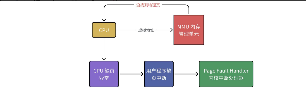 设想,CPU 给 MMU 的虚拟地址,在 TLB 和⻚表都没有找到对应的物理⻚,该怎么办呢?其实这就是 缺⻚异常 Page Fault ,它是⼀个由硬件中断触发的可以由软件逻辑纠正的错误。假如⽬标内存⻚在物理内存中没有对应的物理⻚或者存在但⽆对应权限,CPU 就⽆法获取数据,这种 情况下CPU就会报告⼀个缺⻚错误。由于 CPU 没有数据就⽆法进⾏计算,CPU罢⼯了⽤⼾进程也就出现了缺⻚中断,进程会从⽤⼾态切换 到内核态,并将缺⻚中断交给内核的 Page Fault Handler 处理。