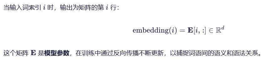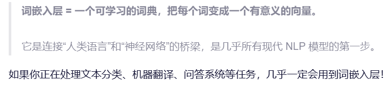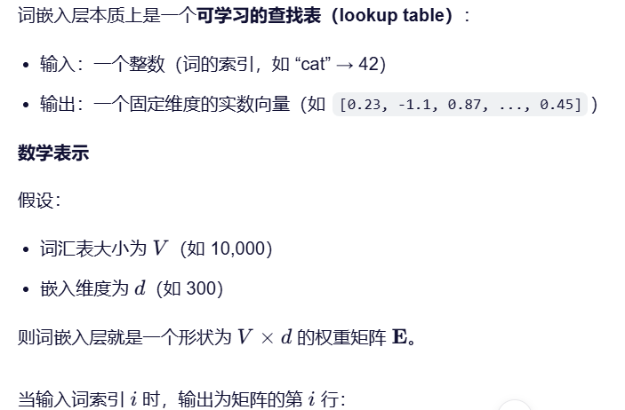 - 计算机无法直接理解“苹果”“跑步”这样的词语。传统方法(如 one-hot 编码)虽然能将词表示为向量,但存在严重问题。因此需要使用词嵌入层,词嵌入通过低维稠密向量(如 128 维、300 维)来表示词语,并在训练过程中自动学习语义关系(例如: