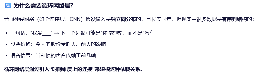 - 循环网络层:通常指循环神经网络(Recurrent Neural Network, RNN) 中的核心计算单元,是一种专门用于处理序列数据(如文本、语音、时间序列)的神经网络层。它的关键特点是:具有记忆能力,能利用先前时刻的信息来影响当前时刻的输出。