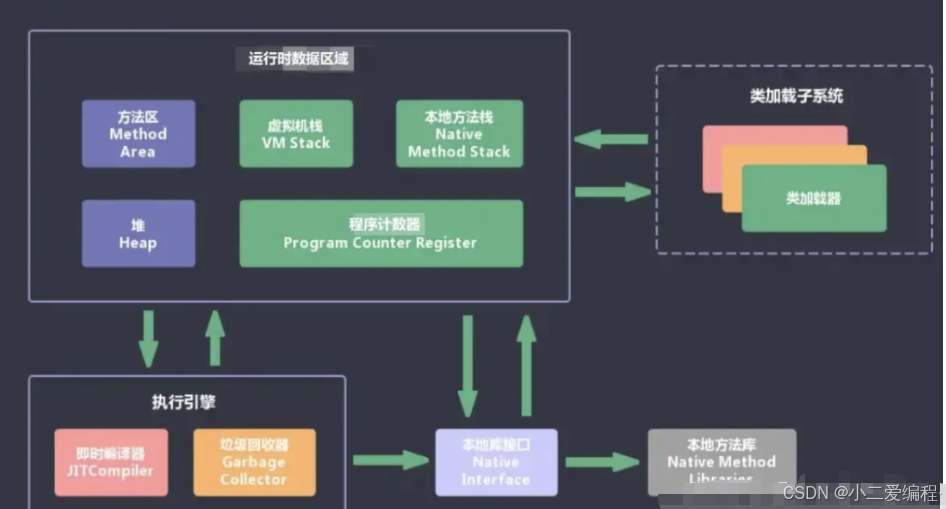 JVM包含两个子系统和两个组件: 两个子系统为Class loader(类装载)、Execution engine(执行引