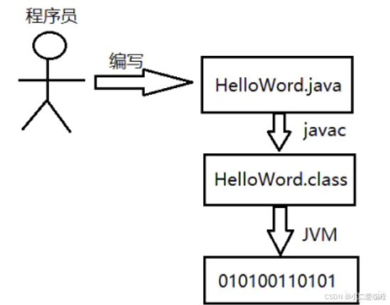 - HelloWord.java是我们程序员编写的,我们人可以认识,但是电脑不认识
