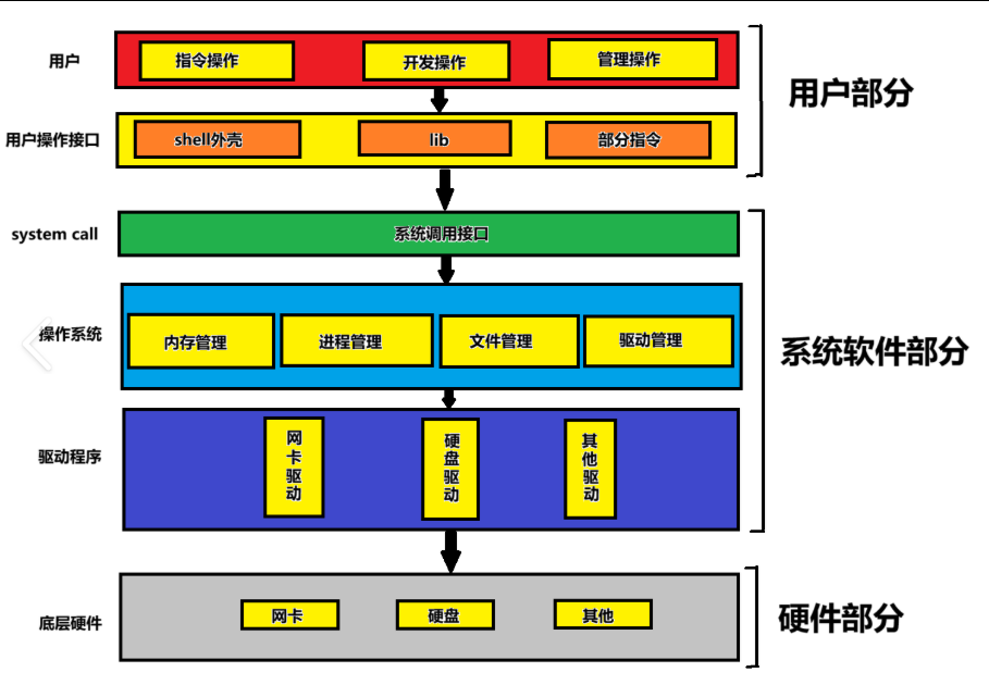 - 内核(进程管理,内存管理,文件管理,驱动管理)