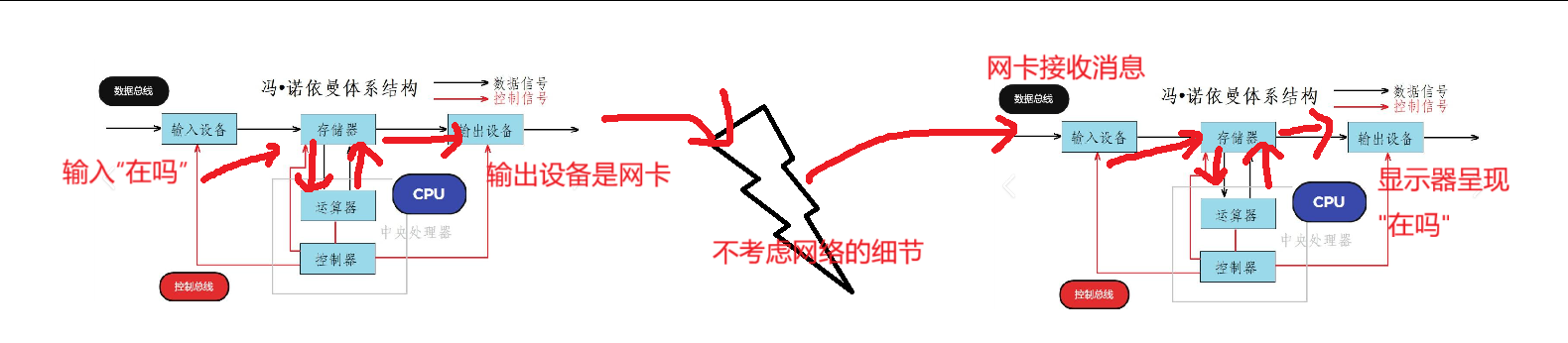 我在键盘上(输入设备)输入“在吗”,数据进入存储器,经过CPU处理,数据回到存储器,继而通过网卡(输出设备)传送到我的朋友的输入设备网卡中,数据再从网卡加载到存储器中,CPU拿到数据并处理,数据然后返回到存储器中,再通过显示器,“在吗”就显示到了我的朋友眼前