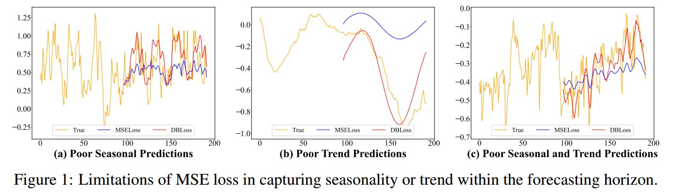 文章指出了现有基于距离的损失函数(如 MSE)在时间序列预测中存在的核心局限性。问题源于它们对时间序列的季节性和趋势成分缺乏针对性的优化: