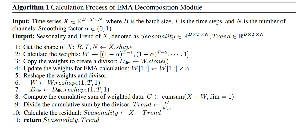 分解选择: 论文选择了指数移动平均 (EMA) 进行分解。