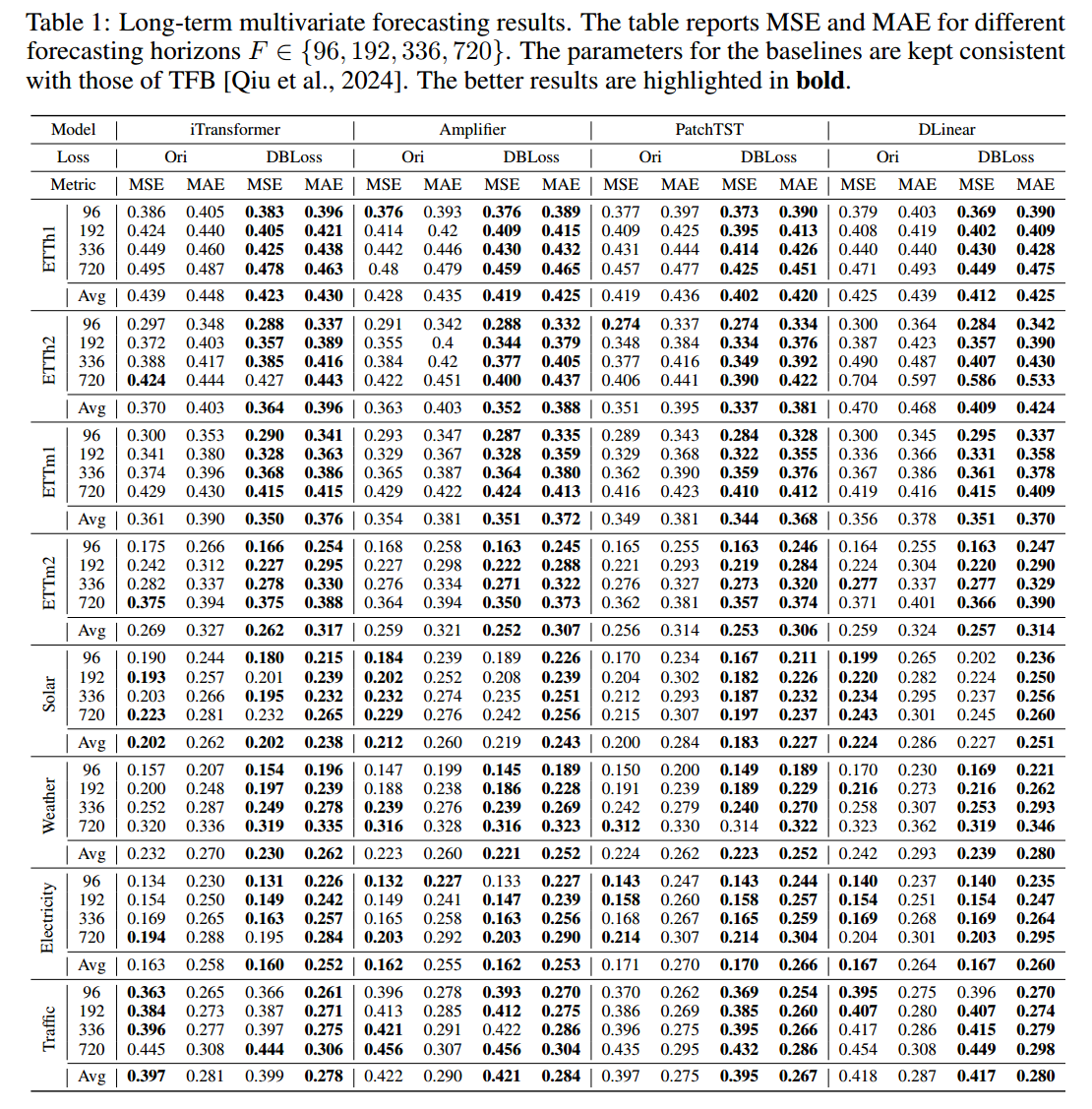 使用 TFB 提供的最优基线脚本,只将训练时的损失函数替换为 DBLoss,而没有对模型架构、超参数、优化器等做任何其他修改。