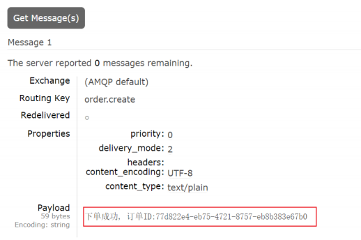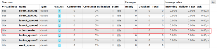 public String createOrder(){//下单相关操作,比如参数校验,操作数据库等,代码省略//发送消息通知String orderId = UUID.randomUUID().toString();OrderInfo orderInfo = new OrderInfo(orderId, "商品", 536);rabbitTemplate.convertAndSend("", "order.create",orderInfo);return "下单成功";