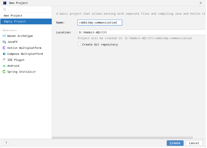 1. 创建⼀个空的项⽬ rabbitmq-communication(其实就是⼀个空的⽂件夹)