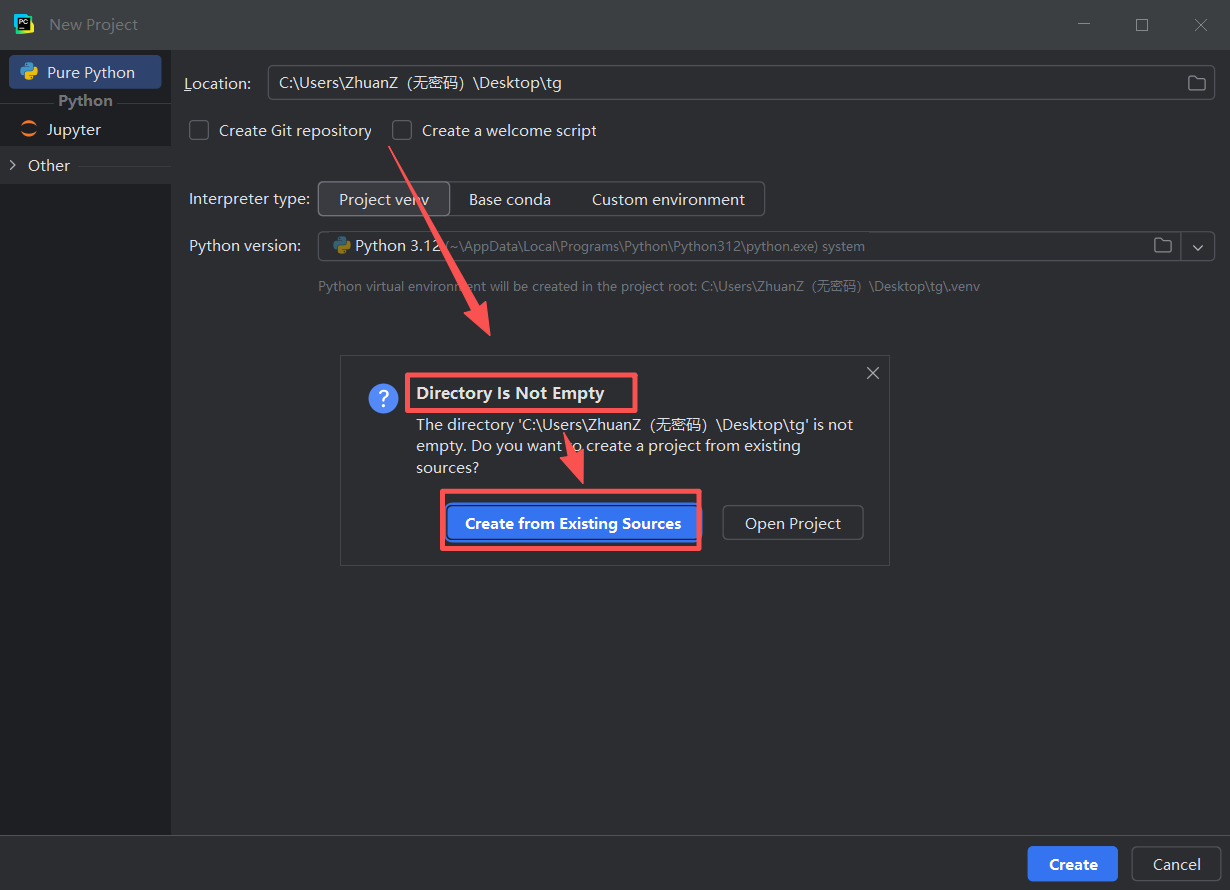 图 22 这个时候出现弹窗,意思就是,目录非空(因为这个目录【文件夹】下面存放了我们的文件,目录不为空,所以系统提示我们要怎么做,是创建项目还是打开这个项目),这里点击创建项目,因为pycharm的功能其实就是运行的时候在一个目录下面创建一个标记,拥有这个标记的目录会被pycharm识别为一个项目,现在这个项目并没有创建pycharm标记,所以点击创建按钮是可行的