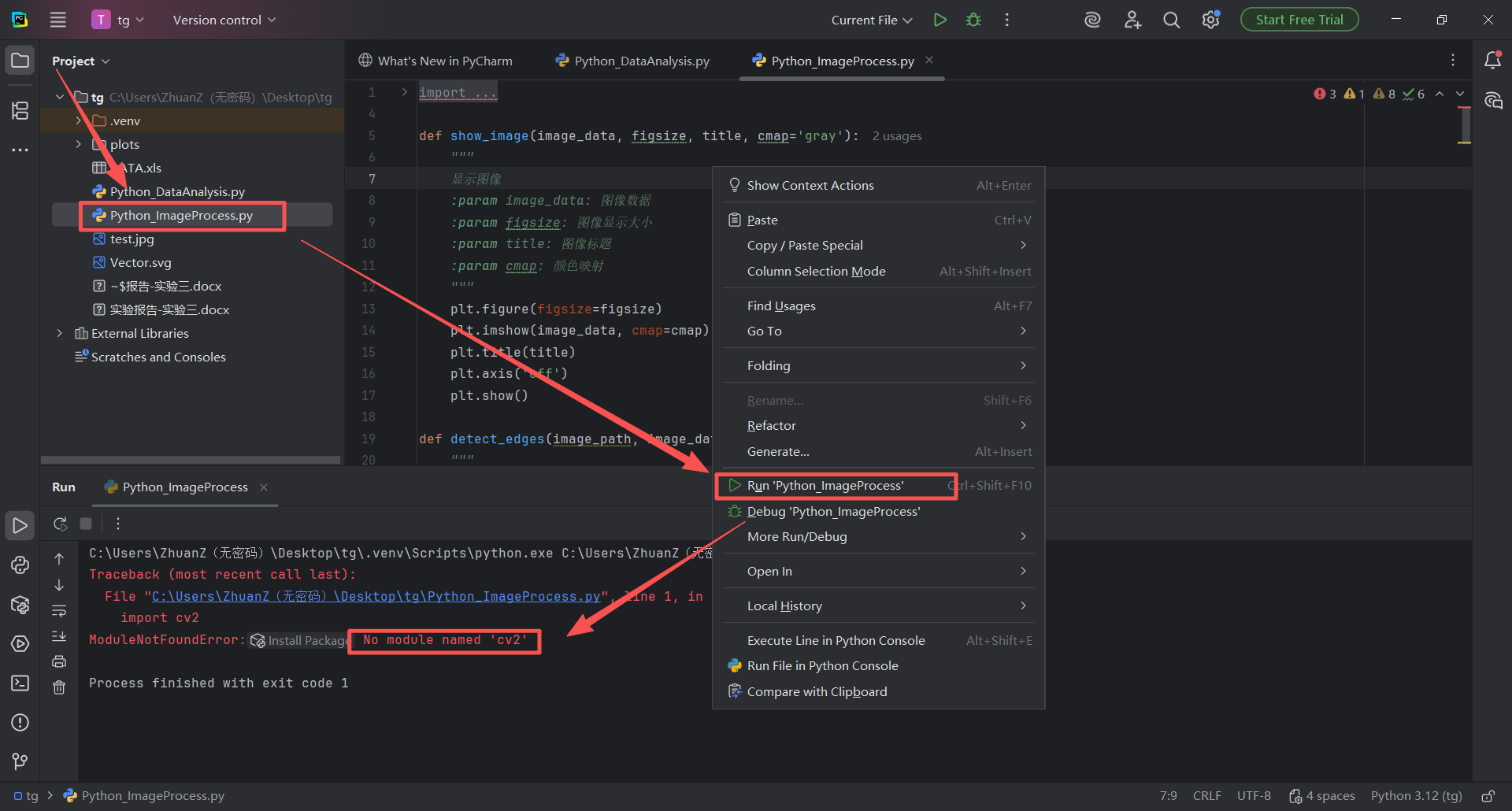 图 41 双击左侧项目目录(也称文件夹)下面的Python_ImageProcess.py代码文件,进入编辑器页面,鼠标左键单击编辑器中任意位置,出现光标之后,鼠标右键悬浮窗中有 Run 'Python_ImageProcess' 的字样(这是运行Python_ImageProcess文件的意思),单击这个字样按钮,控制台输出如图红色错误,这是因为我们的python解释器发现缺乏代码中需要使用到的cv2包(也称库),这种情况就需要安装对应的包和库了