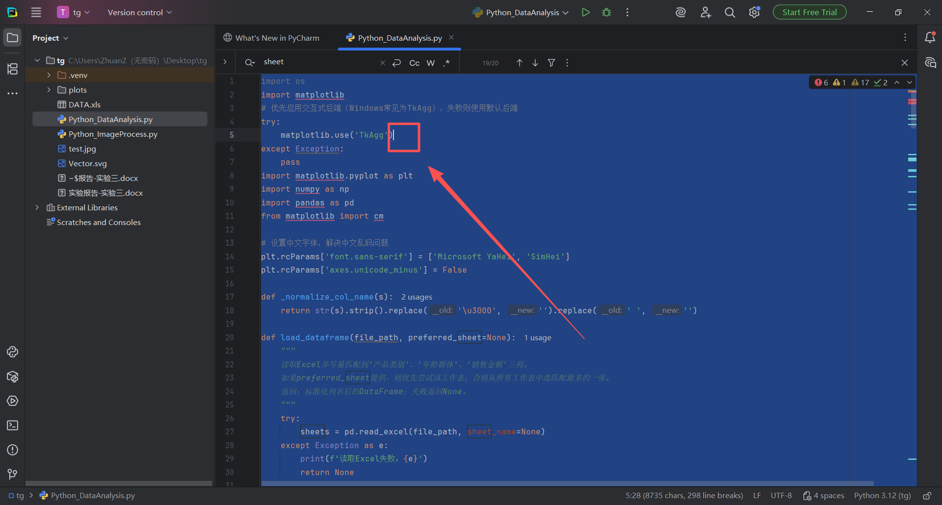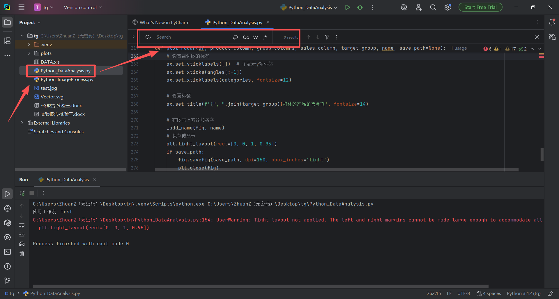 图 38 进入pycharm中编辑Python_DataAnalysis.py文件的页面,鼠标左键单击,出现光标之后,使用搜素快捷键(同时按下ctrl键和f字母键),召唤出来图中框选的搜索栏(搜索栏输入器中可以快速检索想要查找的代码字段)
