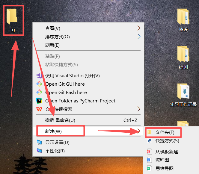 图 2 新建好的文件夹在桌面上,一开始是这种空文件夹的状态(文件夹起名最好全英文,这样可以避免电脑编码错误导致报错)担心有些同学不知道如何新建文件夹,这里说一下,鼠标左键点击空白位置,右键鼠标之后出现如图所示选项,依次选中就可以新建了