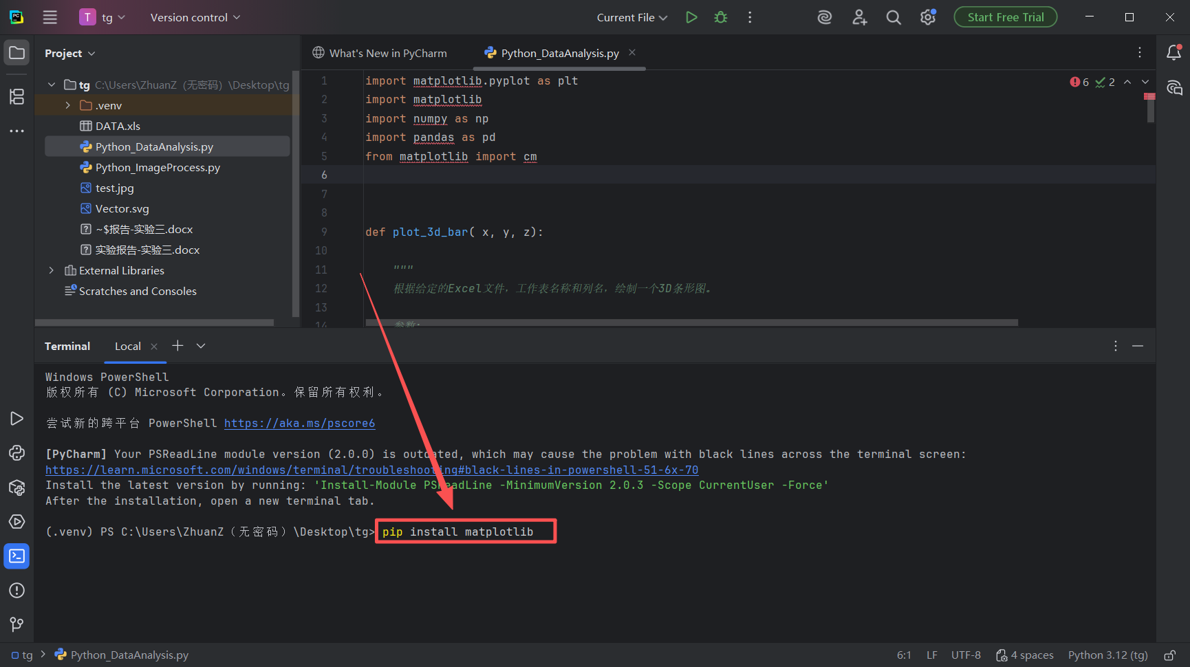 图 28 在图中所示区域,输入代码:pip install matplotlib,然后点击回车(也就是enter键)等待代码运行,这句代码意思是使用名为pip的python工具在python官方库下载一个名为matplotlib的绘图工具包