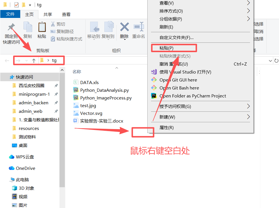 图 3 双击进入刚刚创建好的名为tg的文件夹(目录)下面,发现地址已经在这个文件夹下面了,然后鼠标右键空白处,滑动鼠标到粘贴按钮,鼠标左键点击粘贴按钮粘贴图1剪切好的多个文件,成功之后返回桌面可以发现效果如图4所示