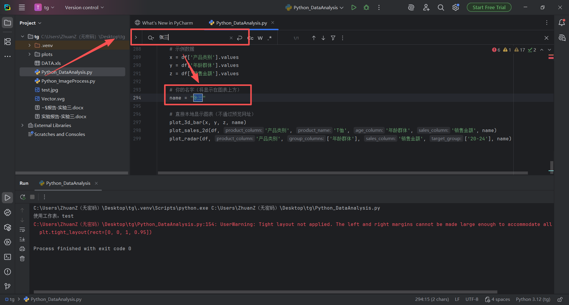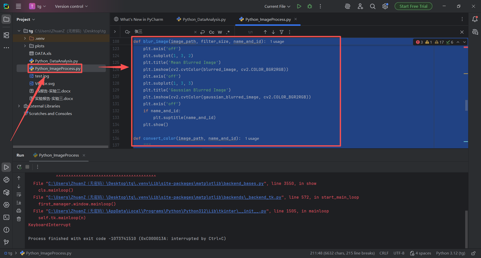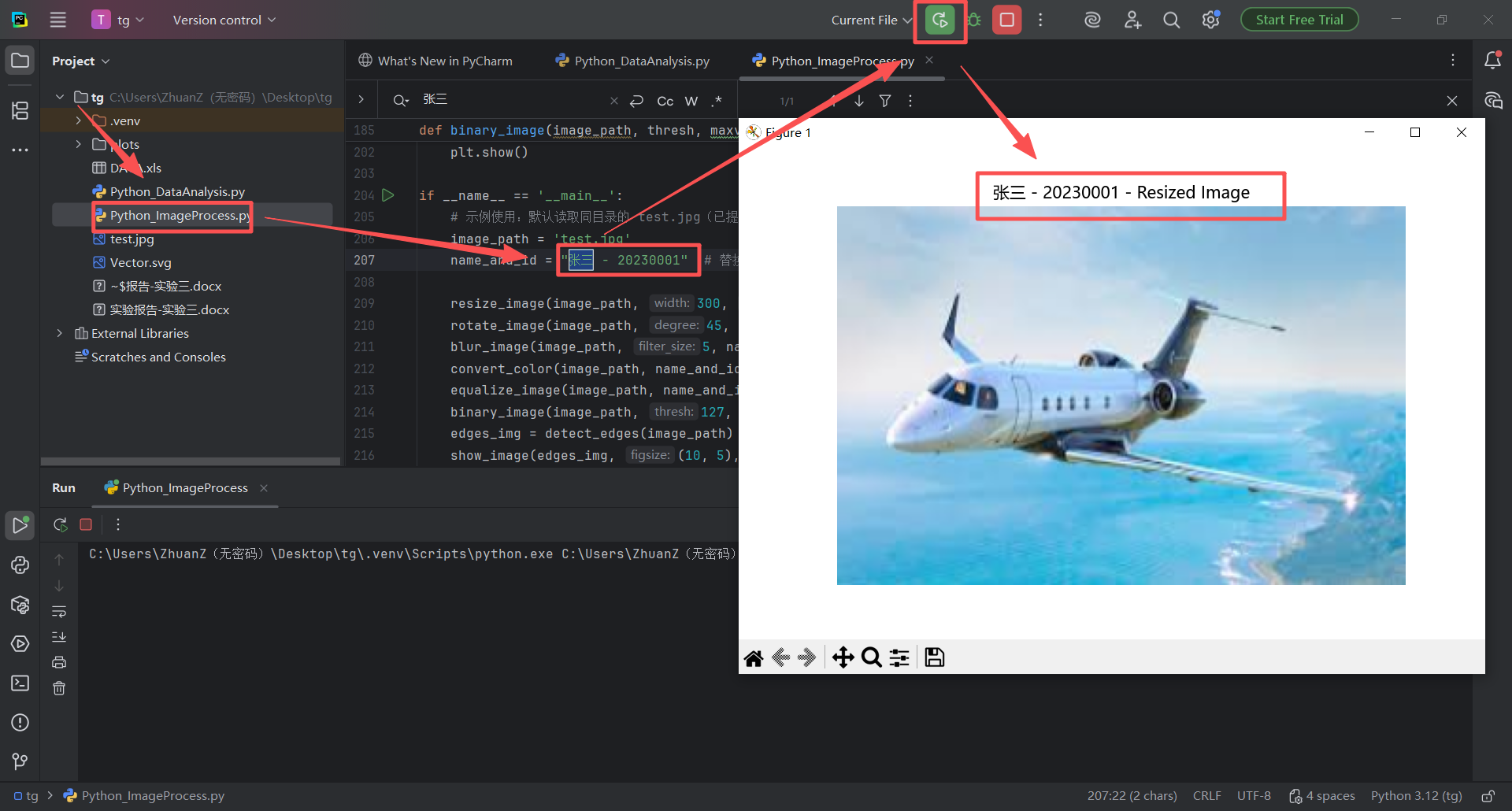 图 45 同样的替换名字学号的步骤,双击Python_ImageProcess.py文件进入pycharm的代码编辑器页面,然后使用搜索快捷键(同时按下ctrl键和f字母键),在搜索栏输入张三,找到指定变量,修改名字和内容,然后点击运行按钮即可