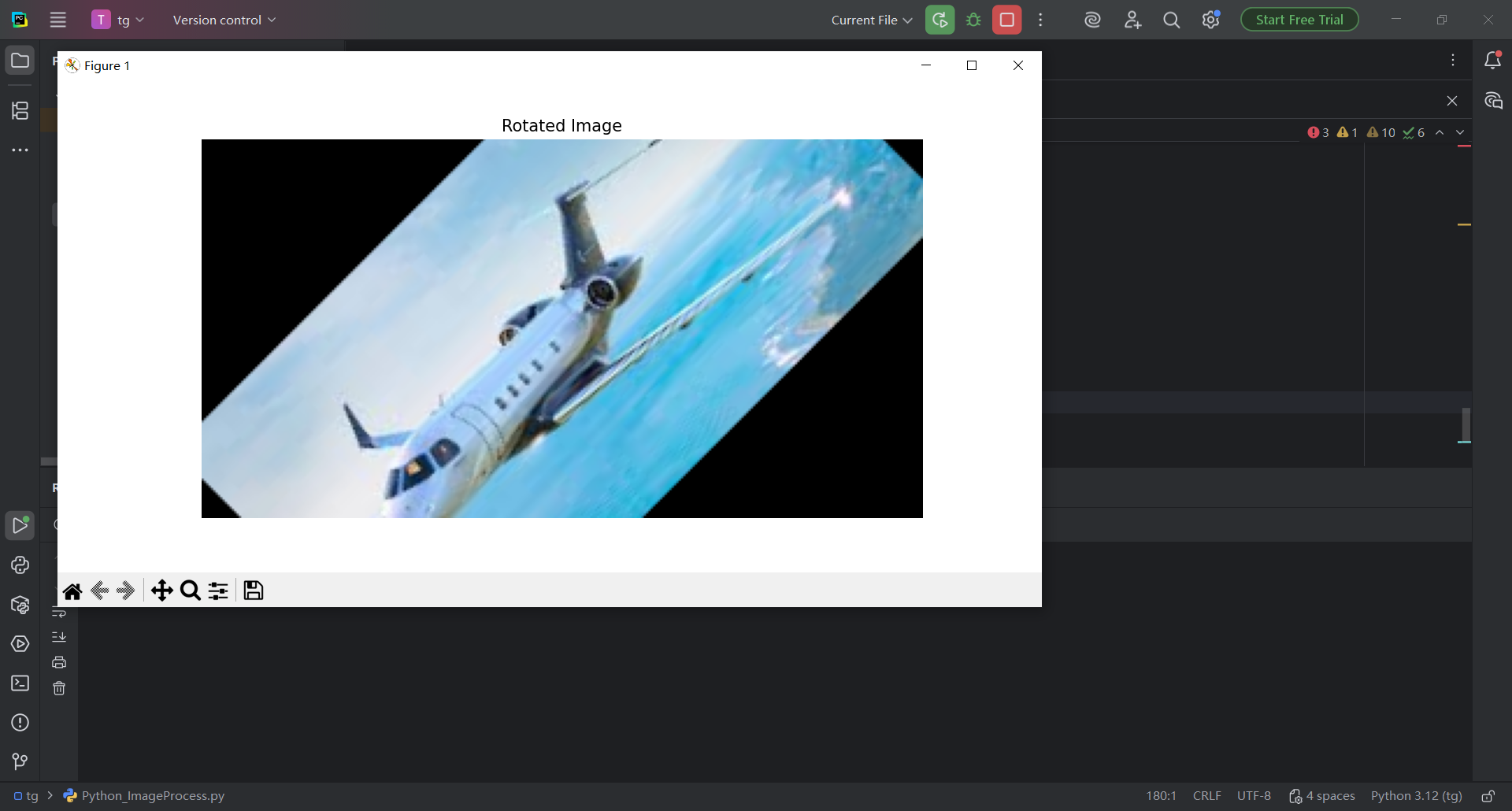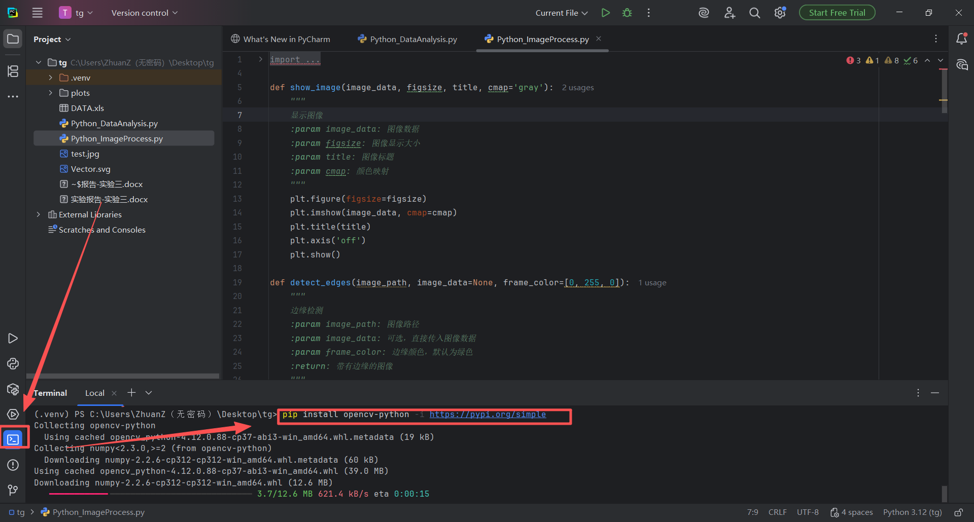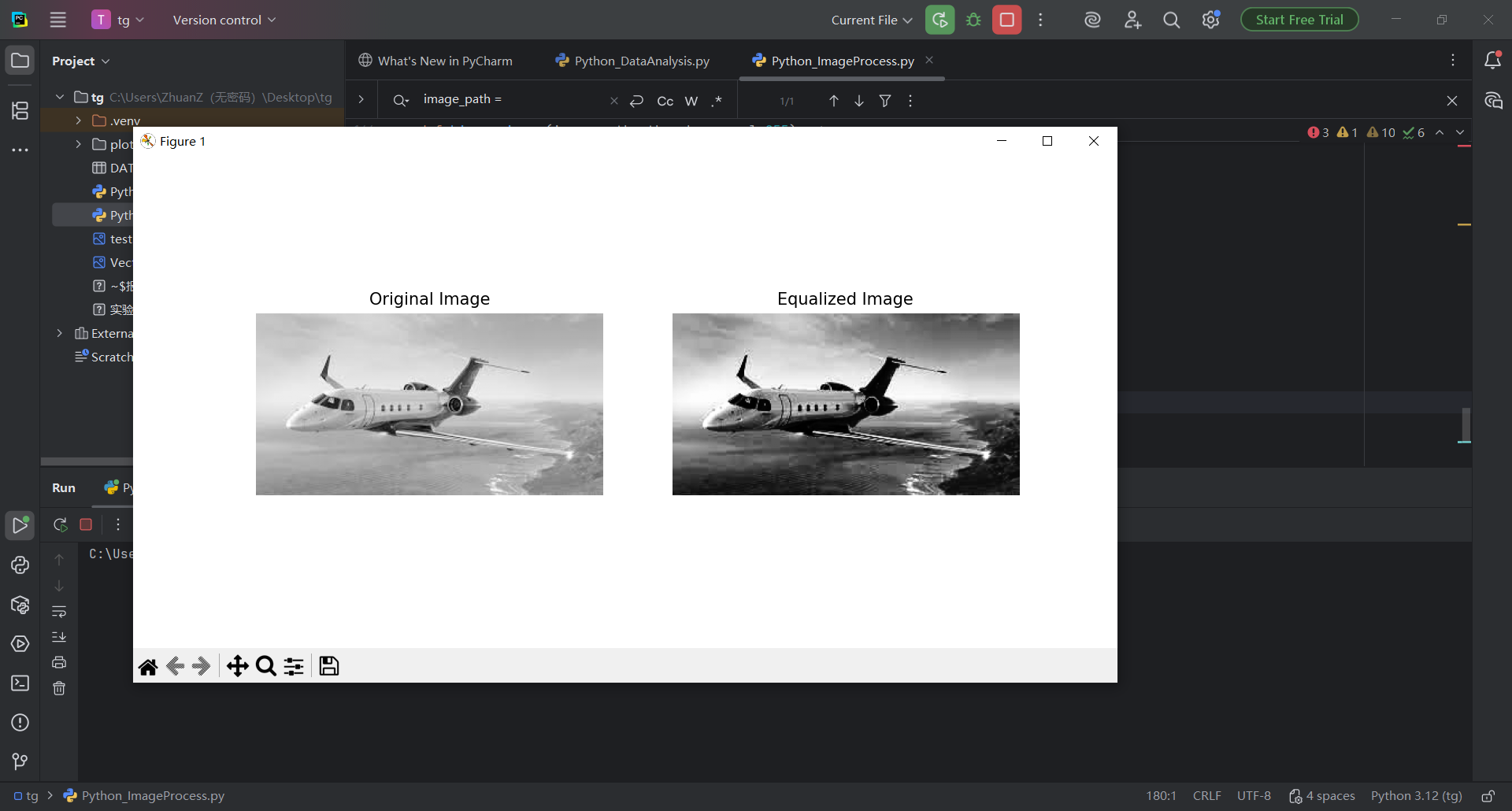 图 45 同样的替换名字学号的步骤,双击Python_ImageProcess.py文件进入pycharm的代码编辑器页面,然后使用搜索快捷键(同时按下ctrl键和f字母键),在搜索栏输入张三,找到指定变量,修改名字和内容,然后点击运行按钮即可