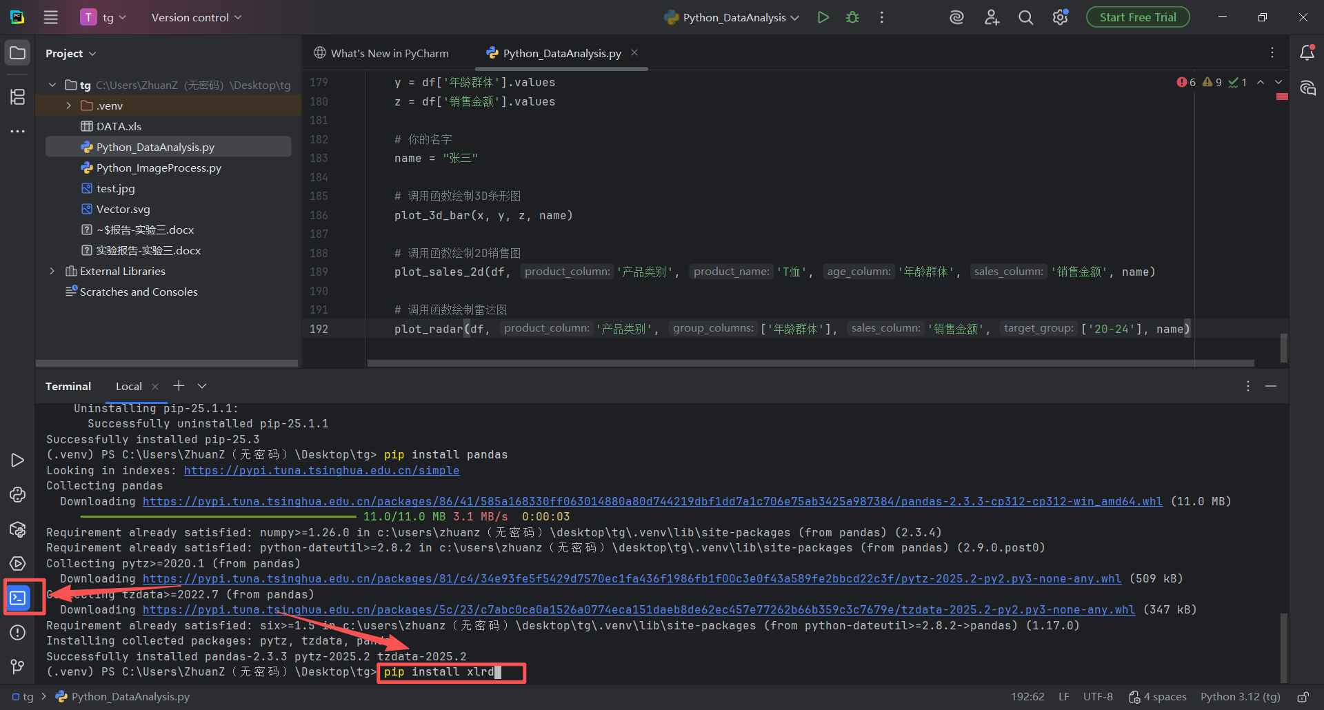 图 33 在终端区域输入pip install xlrd 并按下回车运行,安装好xlrd库