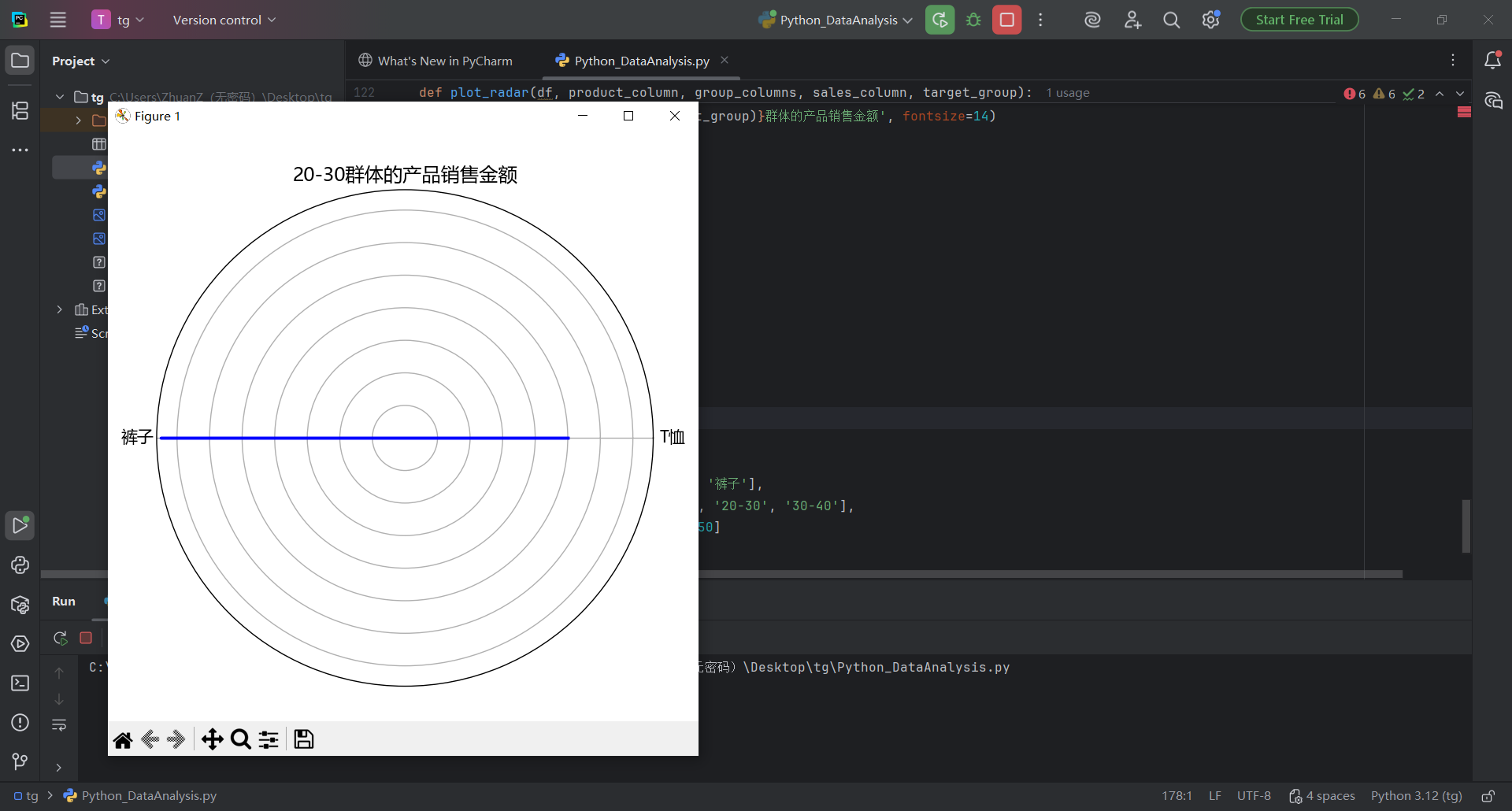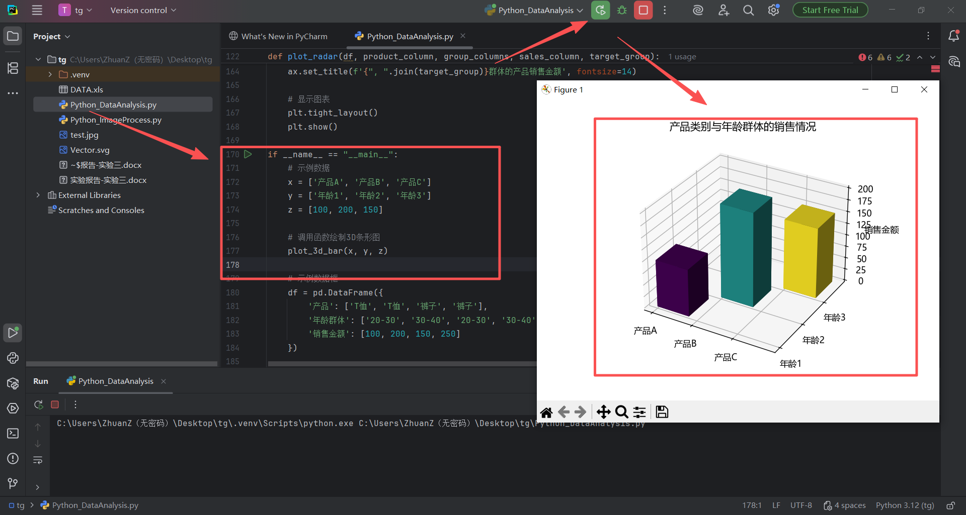 if __name__ == "__main__":# 示例数据x = ['产品A', '产品B', '产品C']y = ['年龄1', '年龄2', '年龄3']z = [100, 200, 150]# 调用函数绘制3D条形图plot_3d_bar(x, y, z)# 示例数据框df = pd.DataFrame({'产品': ['T恤', 'T恤', '裤子', '裤子'],'年龄群体': ['20-30', '30-40', '20-30', '30-40'],'销售金额': [100, 200, 150, 250]})# 调用函数绘制2D销售图plot_sales_2d(df, '产品', 'T恤', '年龄群体', '销售金额')# 调用函数绘制雷达图plot_radar(df, '产品', ['年龄群体'], '销售金额', ['20-30'])