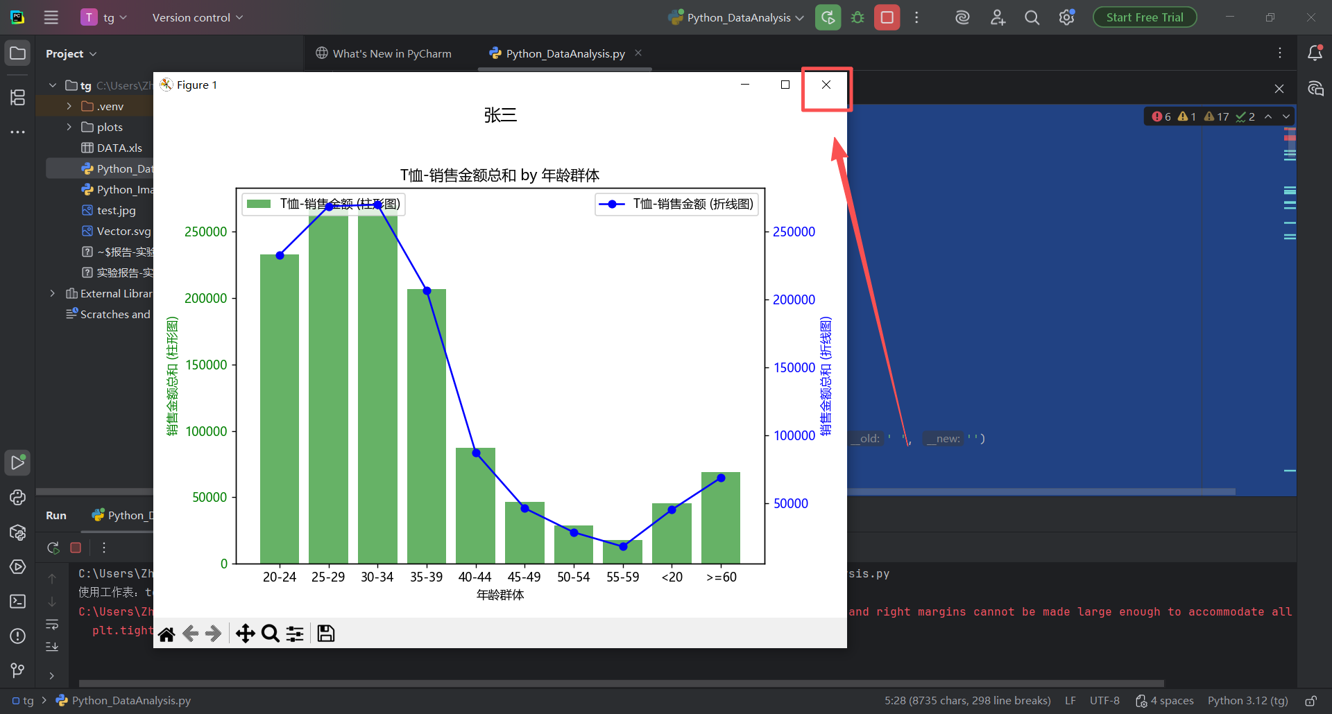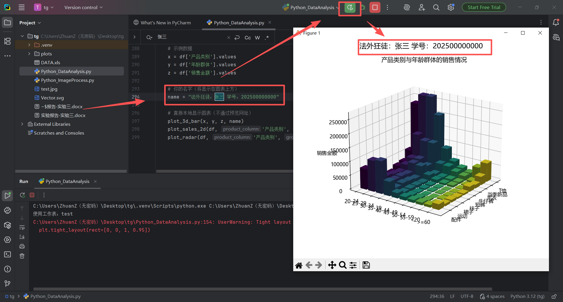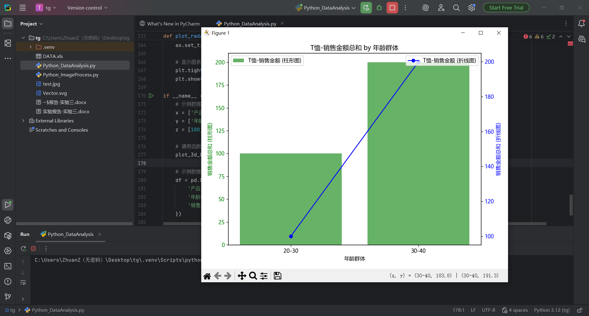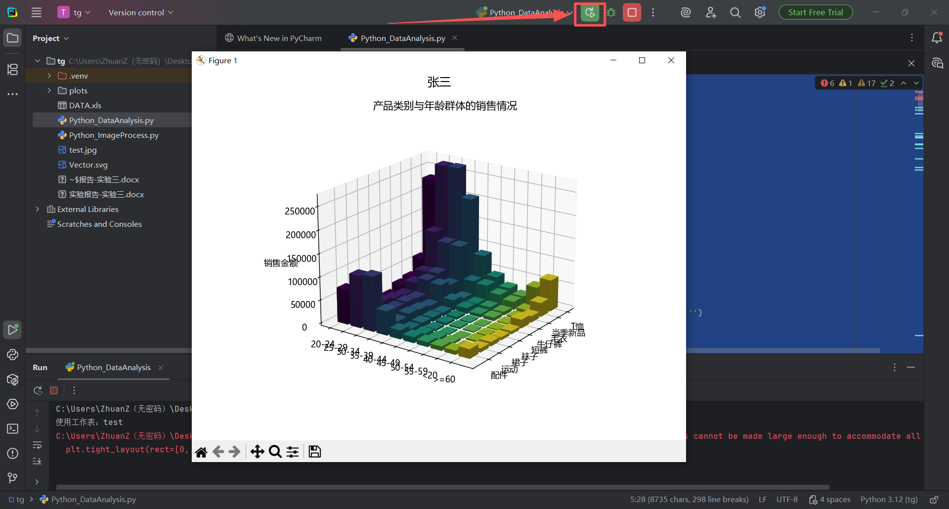 plt.rcParams['axes.unicode_minus'] = Falsedef _normalize_col_name(s):return str(s).strip().replace('\u3000', '').replace(' ', '')def load_dataframe(file_path, preferred_sheet=None):"""读取Excel并尽量匹配到'产品类别'、'年龄群体'、'销售金额'三列。如果preferred_sheet提供,则优先尝试该工作表;否则从所有工作表中选匹配最多的一张。返回:标准化列名后的DataFrame;失败返回None。"""try:sheets = pd.read_excel(file_path, sheet_name=None)except Exception as e:print(f'读取Excel失败:{e}')return Nonesynonyms = {'产品类别': ['产品类别', '商品类别', '类别', '品类', '产品类型', '产品种类'],'年龄群体': ['年龄群体', '年龄段', '年龄组', '年龄', '年龄范围'],'销售金额': ['销售金额', '销售额', '金额', '销售', '总金额', '订单金额']}normalized_synonyms = {k: {_normalize_col_name(v) for v in vs} for k, vs in synonyms.items()}def try_match(df):norm_map = {c: _normalize_col_name(c) for c in df.columns}found = {}for canon, candidates in normalized_synonyms.items():for original, norm in norm_map.items():if norm in candidates:found[canon] = originalbreakreturn foundchosen_df = Nonechosen_sheet_name = Nonebest_found = {}# 优先尝试preferred_sheetif preferred_sheet and preferred_sheet in sheets:df = sheets[preferred_sheet]found = try_match(df)best_found = foundif len(found) == 3:chosen_df = df.rename(columns={found['产品类别']: '产品类别',found['年龄群体']: '年龄群体',found['销售金额']: '销售金额'})chosen_sheet_name = preferred_sheetprint(f'使用工作表:{preferred_sheet}')return chosen_df# 遍历所有工作表,选择匹配最多的一张for sname, df in sheets.items():found = try_match(df)if len(found) > len(best_found):best_found = foundrename_map = {}if '产品类别' in found:rename_map[found['产品类别']] = '产品类别'if '年龄群体' in found:rename_map[found['年龄群体']] = '年龄群体'if '销售金额' in found:rename_map[found['销售金额']] = '销售金额'chosen_df = df.rename(columns=rename_map)chosen_sheet_name = snameif len(found) == 3:breakif chosen_df is None:print('未找到可用的工作表。')return Nonemissing = {k for k in ['产品类别', '年龄群体', '销售金额'] if k not in chosen_df.columns}if missing:print(f"工作表'{chosen_sheet_name}'缺少列:{', '.join(missing)}。实际列为:{list(chosen_df.columns)}")return Noneprint(f'使用工作表:{chosen_sheet_name}')return chosen_dfdef _add_name(fig, name):# 将名字置于图表上方fig.suptitle(name, fontsize=14, y=0.98)def plot_3d_bar(x, y, z, name, save_path=None):"""根据给定的数据绘制3D条形图,并在图表中添加名字。参数:x: x轴数据(产品类别)y: y轴数据(年龄群体)z: z轴数据(销售金额)name: 要显示的名字"""# 先按“产品类别-年龄群体”汇总,减少绘制数量df_raw = pd.DataFrame({'产品类别': x, '年龄群体': y, '销售金额': z})grouped = df_raw.groupby(['产品类别', '年龄群体'], as_index=False)['销售金额'].sum()# 唯一类别x_unique = grouped['产品类别'].unique()y_unique = grouped['年龄群体'].unique()# 创建索引映射x_index_map = {val: idx for idx, val in enumerate(x_unique)}y_index_map = {val: idx for idx, val in enumerate(y_unique)}x_indices = grouped['产品类别'].map(x_index_map).valuesy_indices = grouped['年龄群体'].map(y_index_map).values# 宽度与高度dx = np.full_like(x_indices, 0.8, dtype=float)dy = np.full_like(y_indices, 0.8, dtype=float)dz = grouped['销售金额'].values# 生成颜色映射colors = cm.viridis(np.linspace(0, 1, len(y_unique))) # 使用viridis颜色映射# 绘制3D条形图fig = plt.figure(figsize=(8, 6))ax = fig.add_subplot(111, projection='3d')# 为每个y轴类别指定一个颜色,并一次性绘制所有条形bar_colors = colors[y_indices]ax.bar3d(x_indices, y_indices, np.zeros_like(dz), dx, dy, dz, color=bar_colors, zsort='average')ax.view_init(elev=20, azim=35)# 设置x轴和y轴的标签ax.set_xticks(np.arange(len(x_unique))) # 设置x轴位置ax.set_xticklabels(x_unique) # 设置x轴标签为产品类别ax.set_yticks(np.arange(len(y_unique))) # 设置y轴位置ax.set_yticklabels(y_unique) # 设置y轴标签为年龄群体# 设置z轴的标签ax.set_zlabel('销售金额') # 设置z轴标签为销售金额# 设置轴标题ax.set_title('产品类别与年龄群体的销售情况')# 在图表上方添加名字_add_name(fig, name)plt.tight_layout(rect=[0, 0, 1, 0.95])if save_path:fig.savefig(save_path, dpi=150, bbox_inches='tight')plt.close(fig)else:plt.show()def plot_sales_2d(df, product_column, product_name, age_column, sales_column, name, save_path=None):"""绘制条形折线复合图,并在图表中添加名字。参数:df: 数据框product_column: 产品列名product_name: 产品名称age_column: 年龄群体列名sales_column: 销售金额列名name: 要显示的名字"""# 根据产品类别筛选数据product_sales = df[df[product_column] == product_name]if product_sales.empty:print(f"没有找到产品 '{product_name}' 的数据,跳过2D图绘制。")return# 计算每个年龄群体的销售金额总和sales_by_age = product_sales.groupby(age_column)[sales_column].sum().reset_index()# 创建图形fig, ax1 = plt.subplots(figsize=(8, 6))# 绘制柱形图ax1.bar(sales_by_age[age_column], sales_by_age[sales_column], color='g', alpha=0.6, label='{}-销售金额 (柱形图)'.format(product_name))ax1.set_xlabel('年龄群体')ax1.set_ylabel('销售金额总和 (柱形图)', color='g')ax1.tick_params(axis='y', labelcolor='g')# 创建第二个y轴ax2 = ax1.twinx()# 绘制折线图ax2.plot(sales_by_age[age_column], sales_by_age[sales_column], marker='o', color='b', linestyle='-',label='{}-销售金额 (折线图)'.format(product_name))ax2.set_ylabel('销售金额总和 (折线图)', color='b')ax2.tick_params(axis='y', labelcolor='b')# 设置标题ax1.set_title('{}-销售金额总和 by 年龄群体'.format(product_name))# 在图表上方