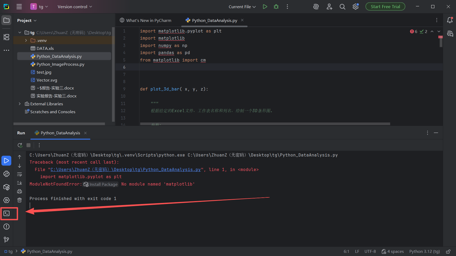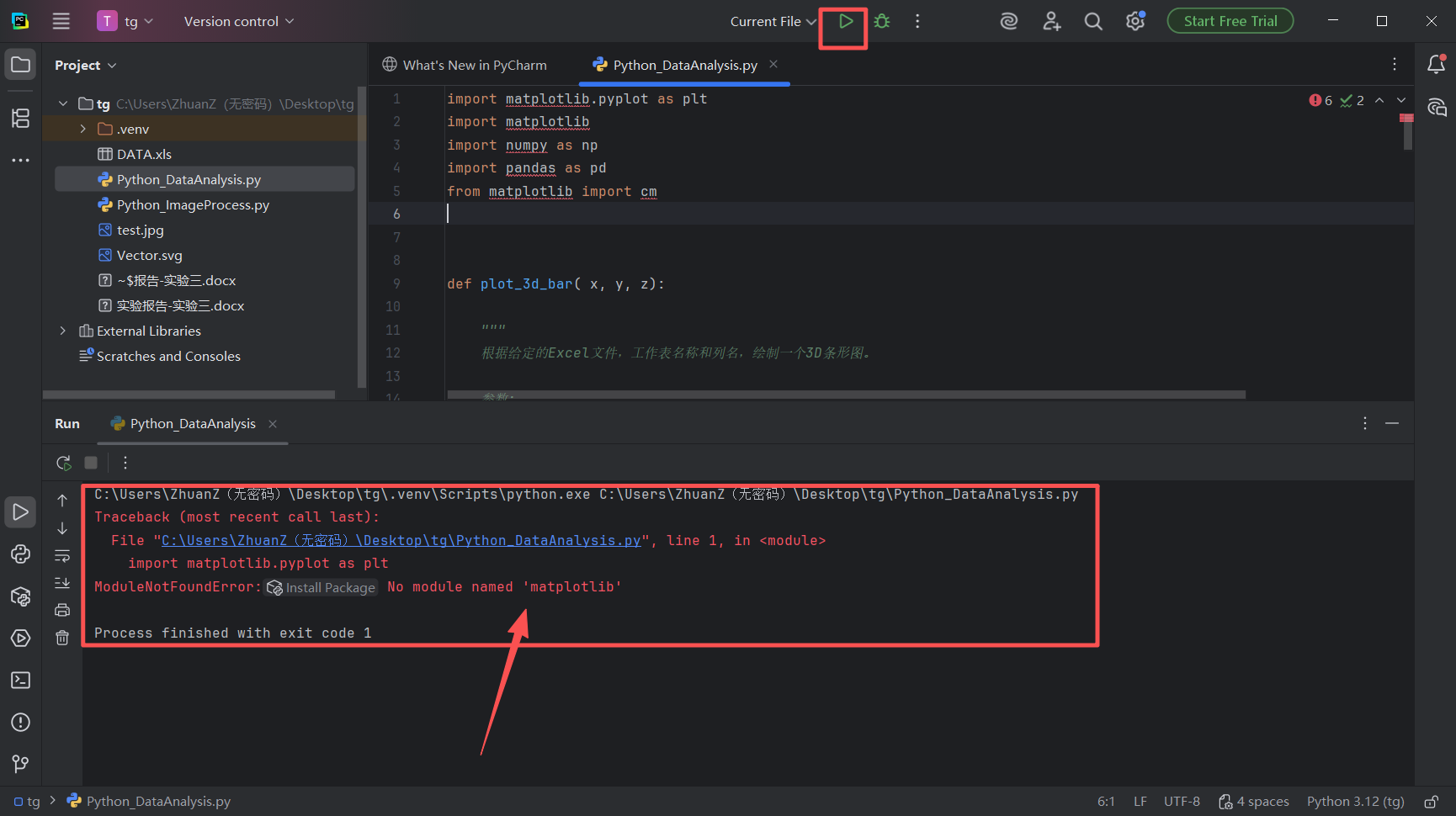 图 26 控制台报错输出红色提示 No module named 'matplotlib'