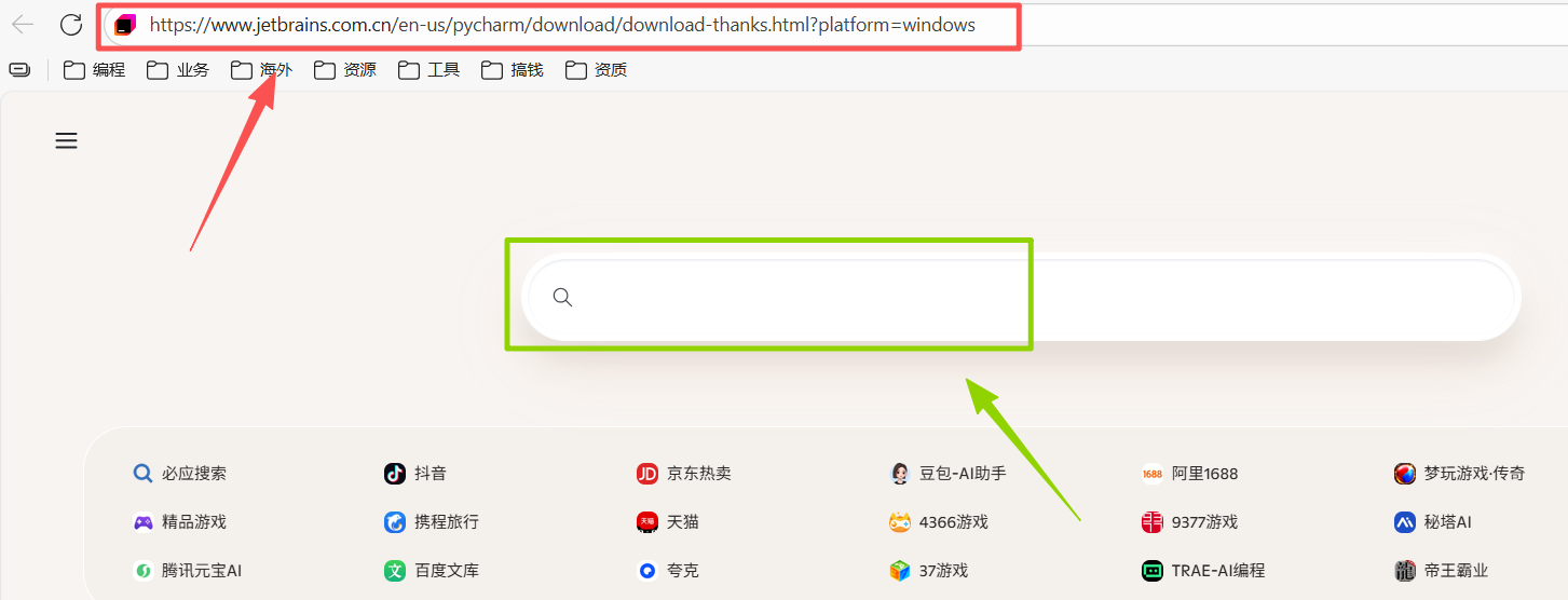 图 6 复制或者双击跳转访问我提供的链接,自己是windows系统就复制Windows的链接,反之复制Macos系统的链接,在一个导航栏(红色是导航栏绿色是搜索栏这两个不一样,要分清楚),在里面输入链接,然后点击回车键(也就是确认键,上面写的是enter,有进入,确认等意思),然后浏览器就会访问页面,并自动下载pycahrm
