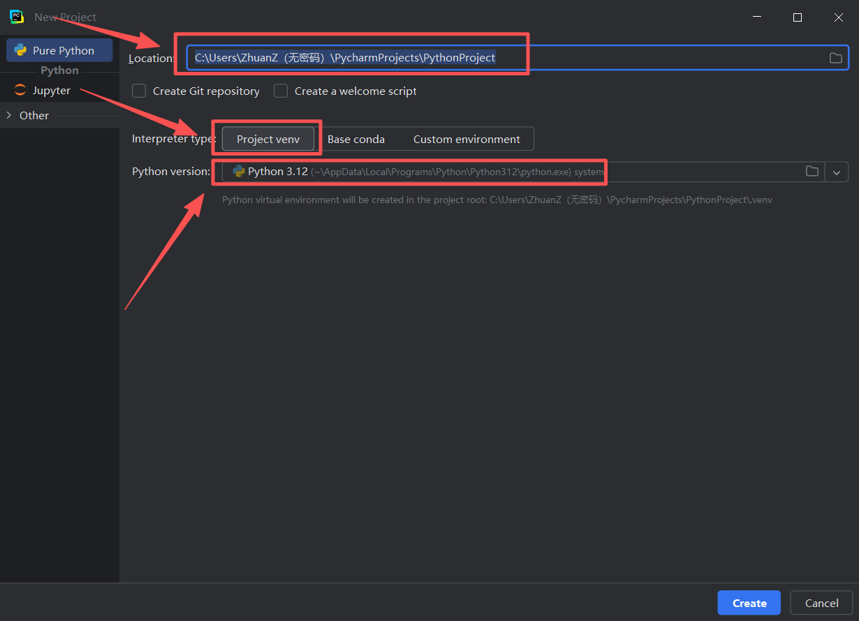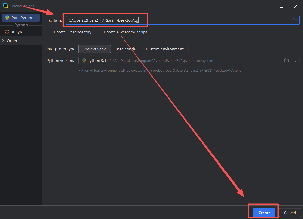 图 21 然后找到之前的pycharm页面,在地址栏里面同时按下ctrl和v键,这是粘贴的快捷键(这样就完成了粘贴路径到对应位置),然后点击右下角蓝色create创建的意思
