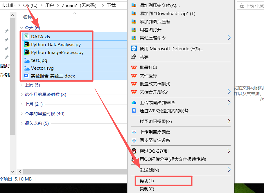 图 1 找到下载好的文件对应的目录下(也称文件夹下面),进入之后长按鼠标左键拖动鼠标选中刚刚下载好的所有文件之后右键鼠标,点击剪切(T),然后前往桌面新建一个文件夹用于存放作业文件