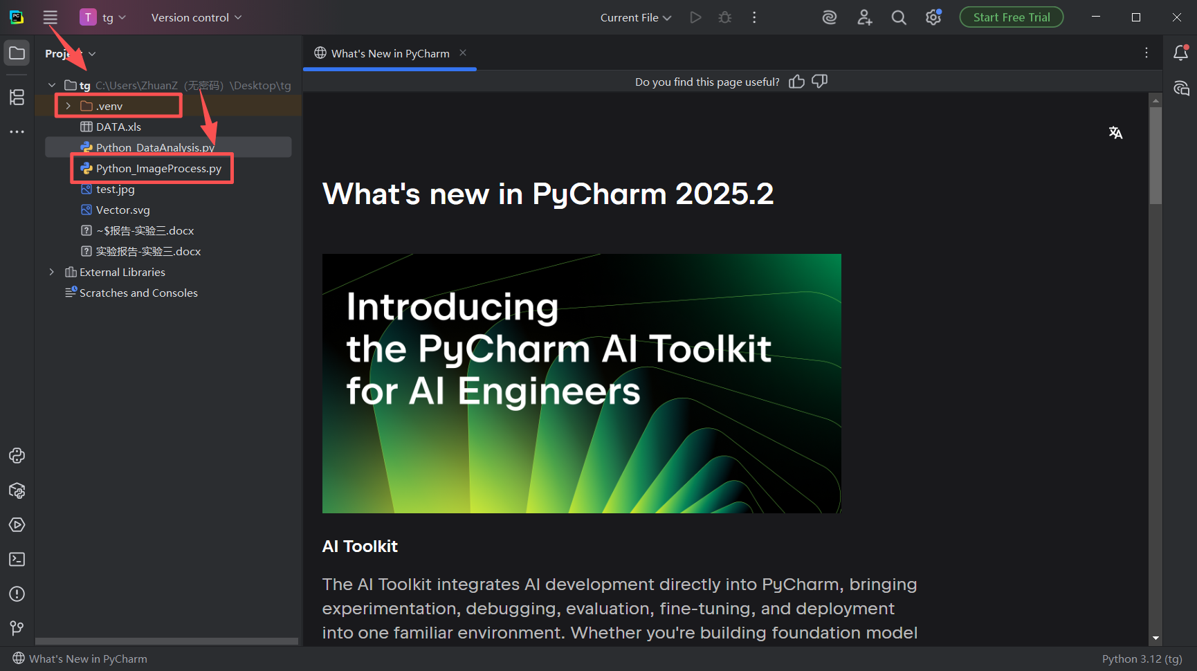 图 23 进入这个页面,发现 框选的 .venv这个目录颜色特殊,下方的.py后缀的文件也有python的蟒蛇标志,说明配置成功,系统已经正常的完成了pycharm和python的建交
