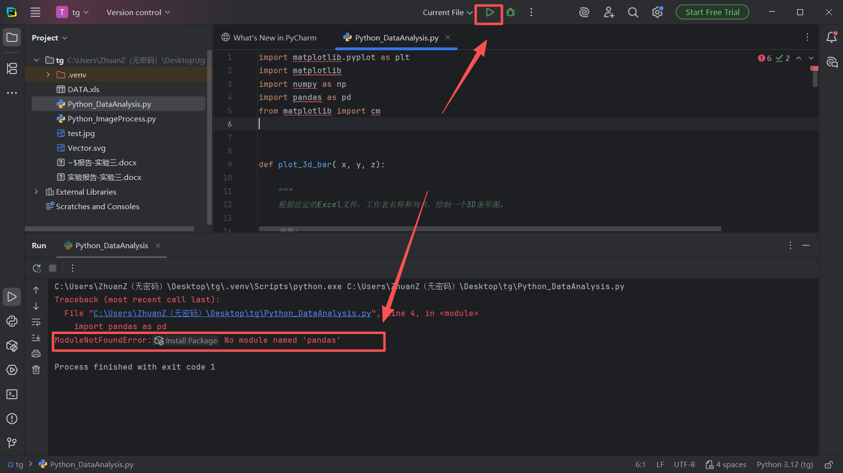 图 30 现在点击运行按钮,项目仍然报错 No module named 'pandas',我们重复前一个步骤,前往终端窗口输入pip install pandas,并按下回车键等待下载安装pandas包(不得不说,pycharm设计的非常美观,安装过程的数据流让我觉得赏心悦目)