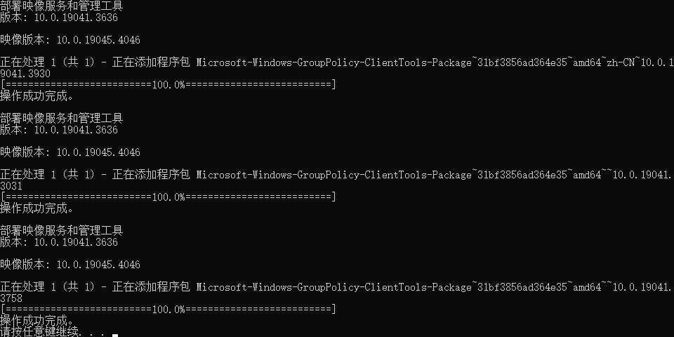 @echo offpushd "%~dp0"dir /b %systemroot%\Windows\servicing\Packages\Microsoft-Windows-GroupPolicy-ClientExtensions-Package~3*.mum >gp.txtdir /b %systemroot%\servicing\Packages\Microsoft-Windows-GroupPolicy-ClientTools-Package~3*.mum >>gp.txtfor /f %%i in ('findstr /i . gp.txt 2^>nul') do dism /online /norestart /add-package:"%systemroot%\servicing\Packages\%%i"pause修改文件后缀,改为gpedit..bat