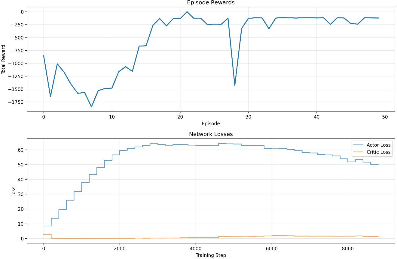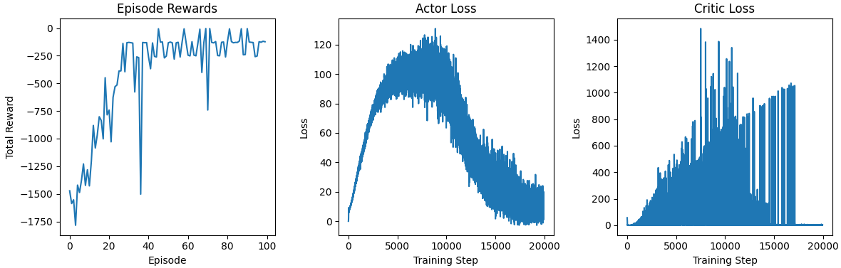 from stable_baselines3.common.callbacks import BaseCallbackclass SimpleTrainingCallback(BaseCallback):def __init__(self, verbose: int = 0):super().__init__(verbose)self.episode_rewards = [] # 每个episode的总奖励self.actor_losses = [] # Actor网络损失self.critic_losses = [] # Critic网络损失self.current_episode_reward = 0 # 当前episode累计奖励def _on_step(self) -> bool:# 累加当前episode的奖励self.current_episode_reward += self.locals['rewards'][0]# 记录网络损失(如果有)log_data = self.logger.name_to_valueif "train/actor_loss" in log_data:self.actor_losses.append(log_data["train/actor_loss"])if "train/critic_loss" in log_data:self.critic_losses.append(log_data["train/critic_loss"])# episode结束 记录总的奖励if self.locals.get('dones', [False])[0]:self.episode_rewards.append(self.current_episode_reward)self.current_episode_reward = 0return Truecallback = SimpleTrainingCallback()model = DDPG("MlpPolicy",env,action_noise=action_noise,verbose=1,learning_starts=1000,train_freq=(1, "episode"))
