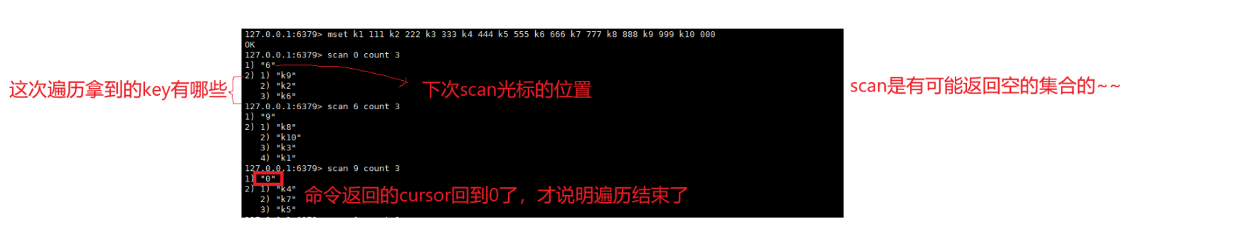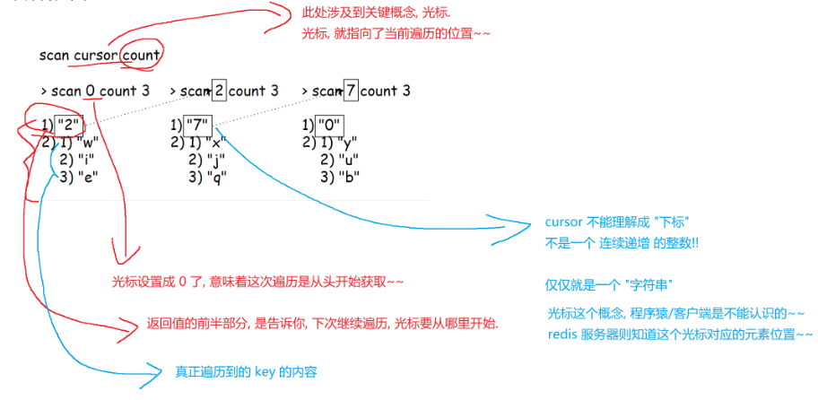 通过渐进式遍历,就可以躲到,既能够获取到所有的key,同时又不会卡死服务器。此处的渐进式遍历指的是:不是一个命令,把所有的key都拿到。而是每执行一次命令,只获取到其中的一小部分~~这样的话保证当前这一次操作不会太卡~~