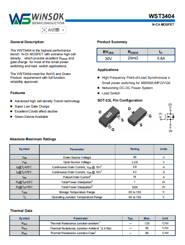 低导通电阻:20mΩ(VGS=10V时),在4A工作电流下导通损耗仅0.32W,较传统50mΩ器件降低60%,显著提升能效。