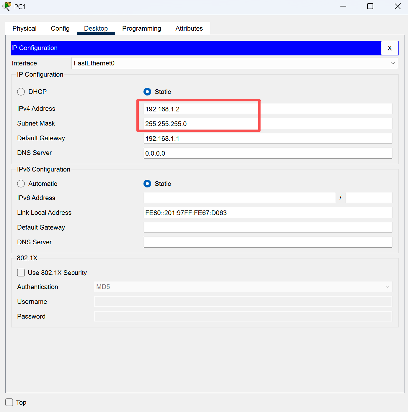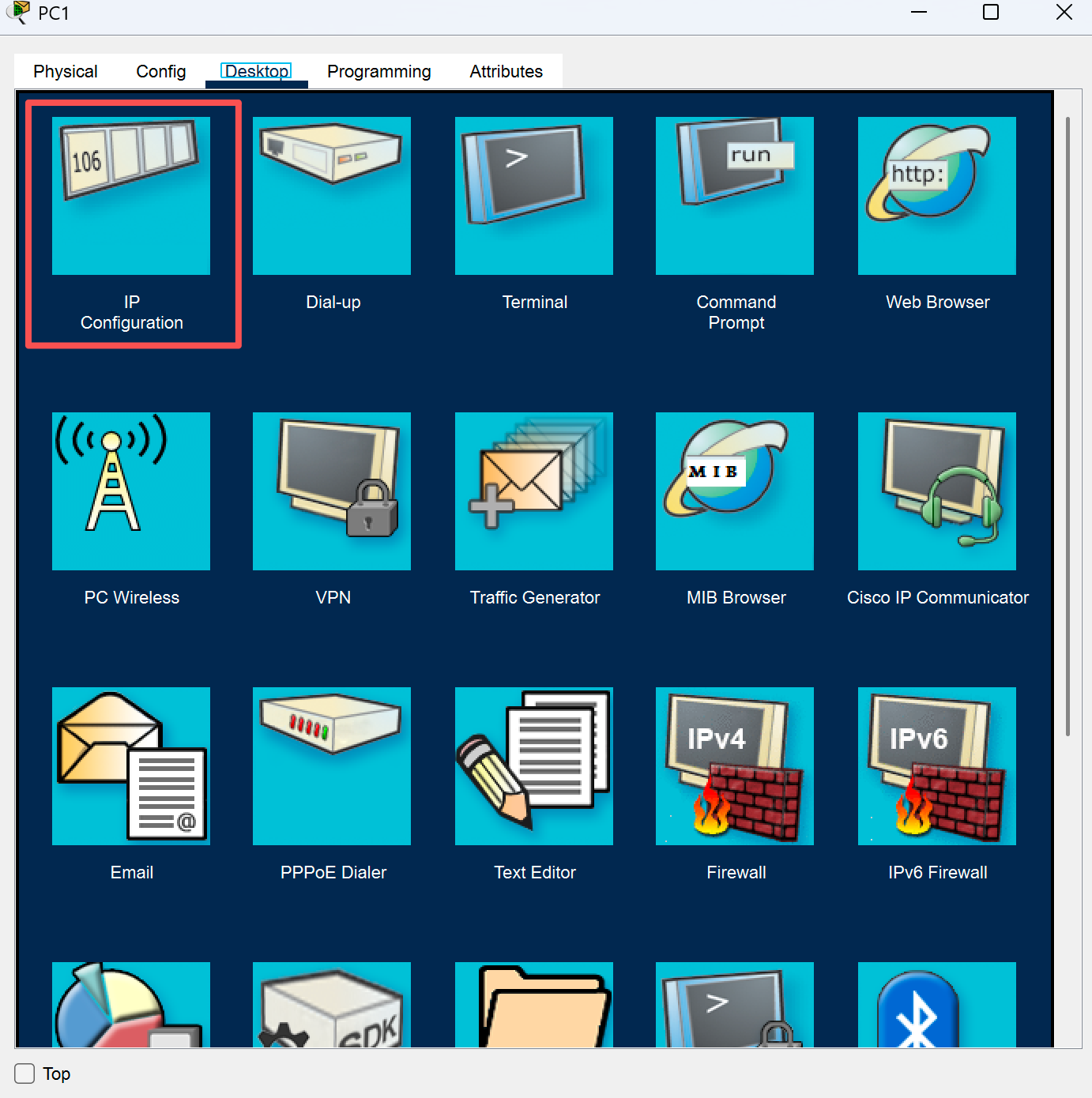 - 双击PC1,进入Desktop(桌面),点击进入 IP Configuration