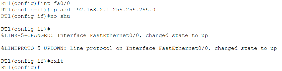 - 进入CLI中,输入 int fa0/0 -> ip add 192.168.2.1 255.255.255.0 -> no shu -> exit