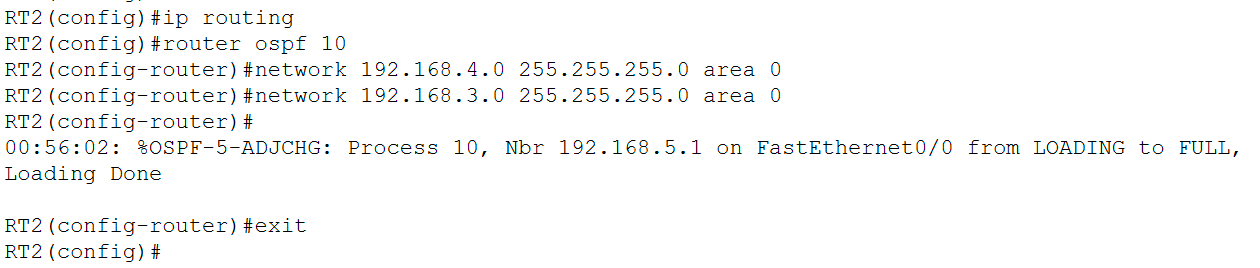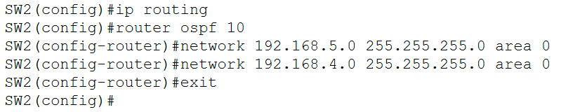 - 进入CLI中,输入 ip routing -> router ospf 10 -> network 192.168.5.0 255.255.255.0 area 0 -> 192.168.4.0 255.255.255.0 area 0 -> exit