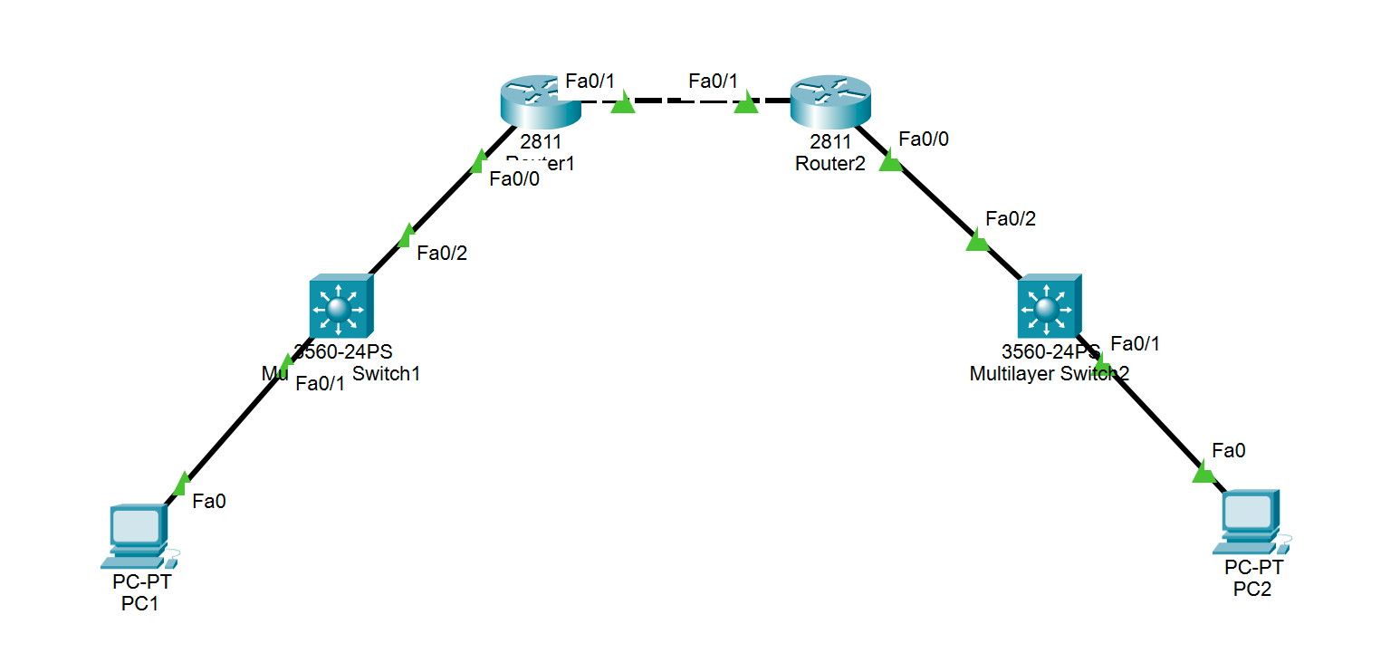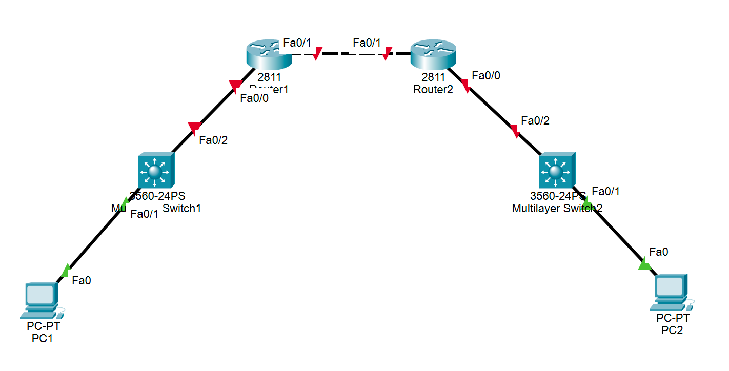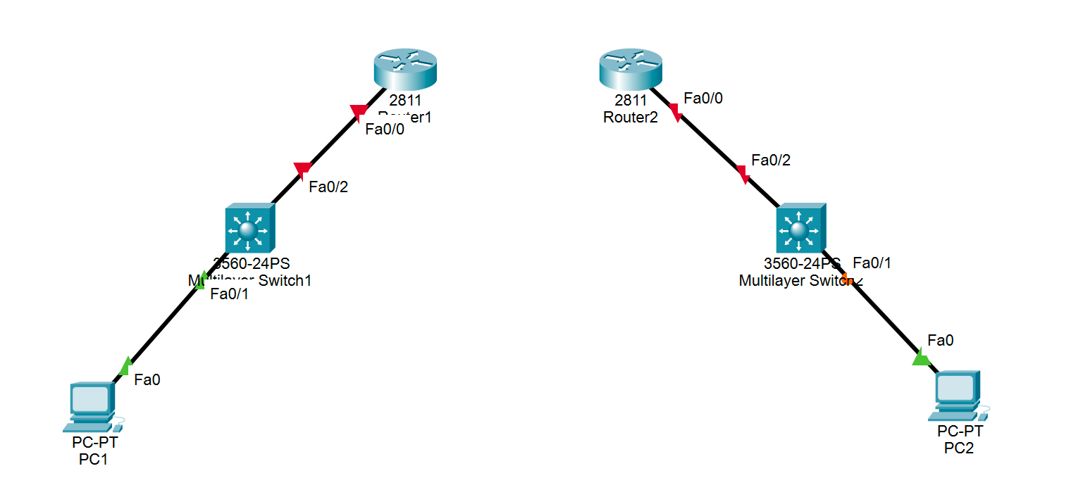 - 用直连线,按照拓扑图提示,将RT1的F0/0端口连SW1的F0/2端口,SW1的F0/1端口连PC1的F0/0端口;将RT2的F0/0端口连SW2的F0/2端口,SW2的F0/1端口连PC2的F0/0端口