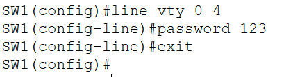 - 为了管理方便,在SW1交换机上配置telnet服务,telnet密码为123