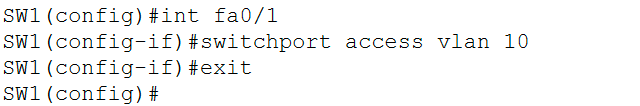 - 输入 int fa0/1 -> switchport access vlan 10 -> exit