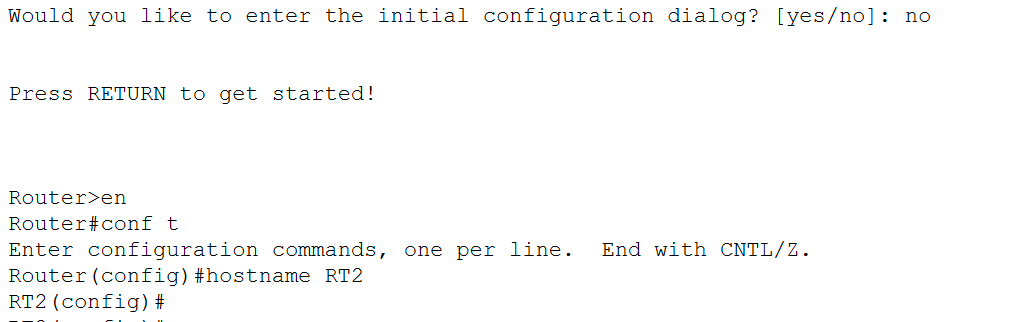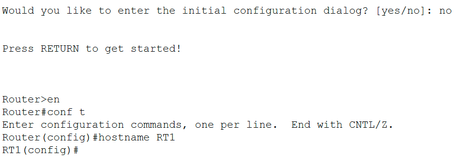 - 输入如图所示,no -> en -> conf t -> hostname RT1