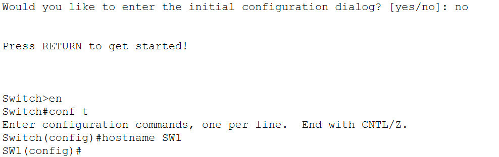 - 输入如图所示,no -> en -> conf t -> hostname SW1
