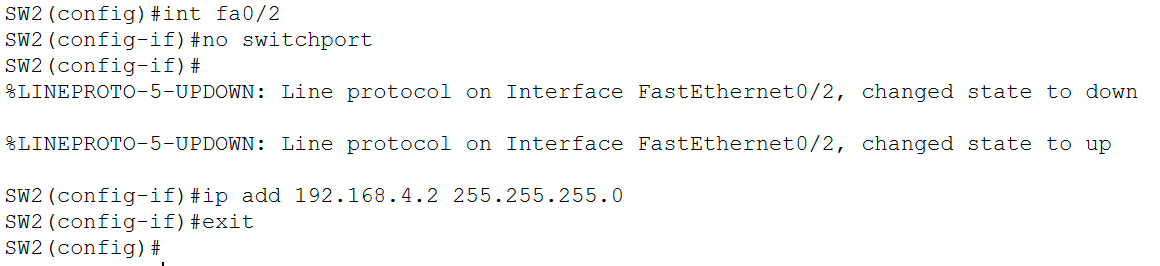 - 输入 int fa0/2 -> no switchport -> ip add 192.168.4.2 255.255.255.0 -> exit