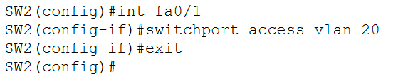 - 输入 int fa0/1 -> switchport access vlan 20 -> exit