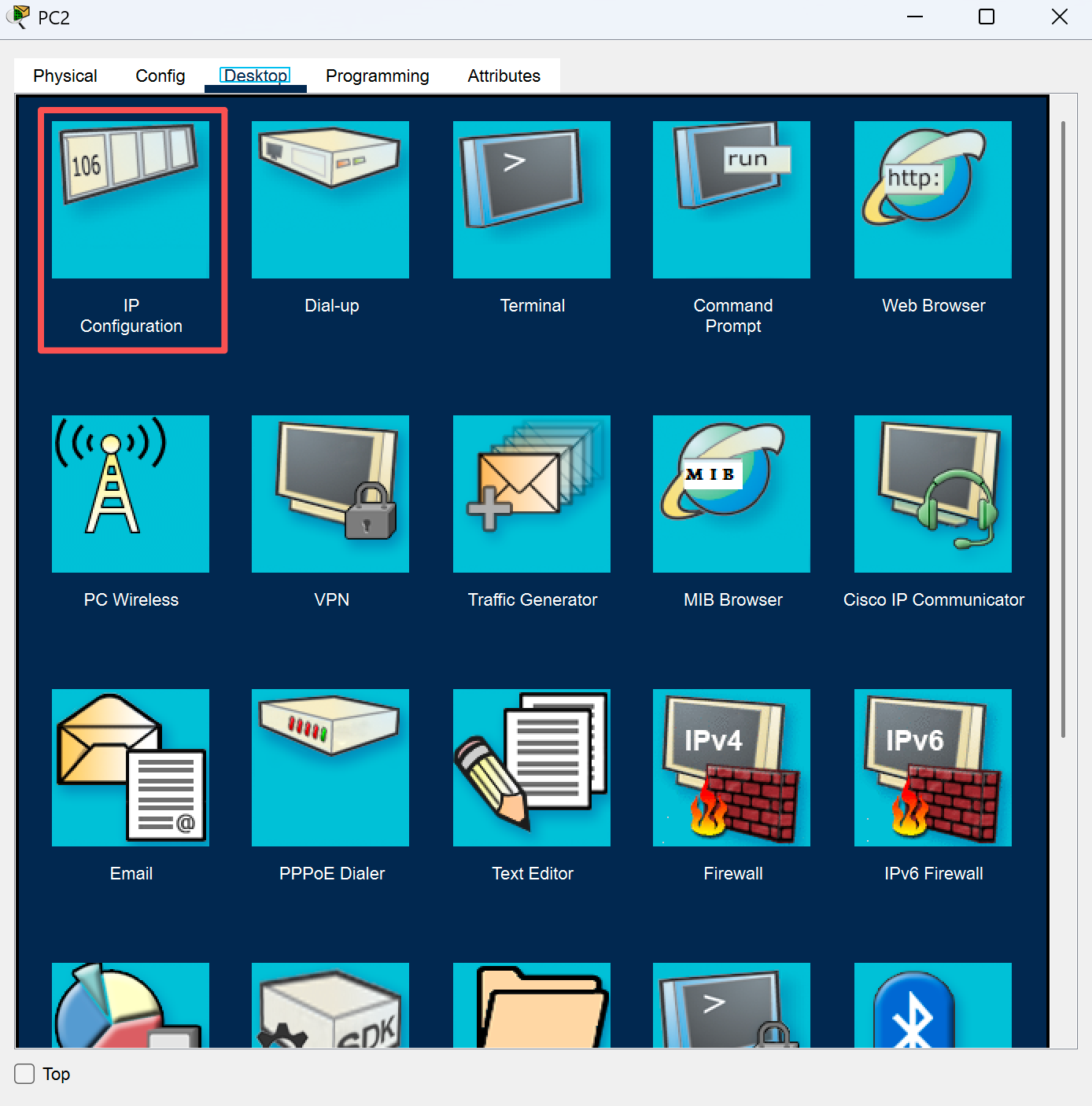 - 双击PC2,进入Desktop(桌面),点击进入 IP Configuration