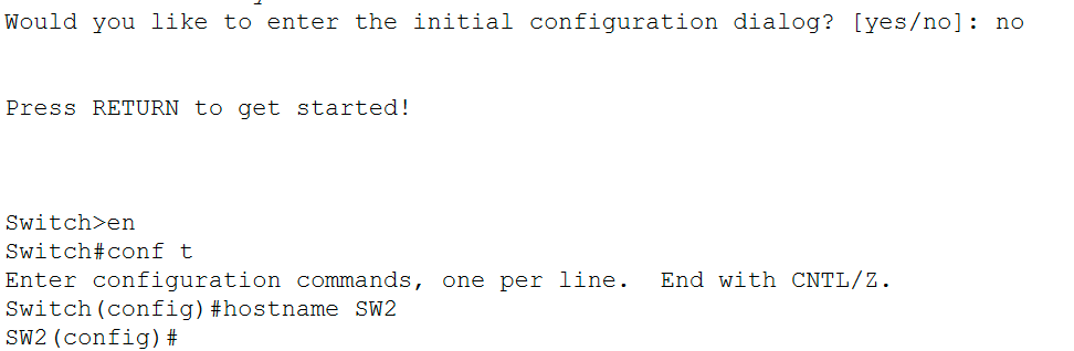 - 输入如图所示,no -> en -> conf t -> hostname SW2